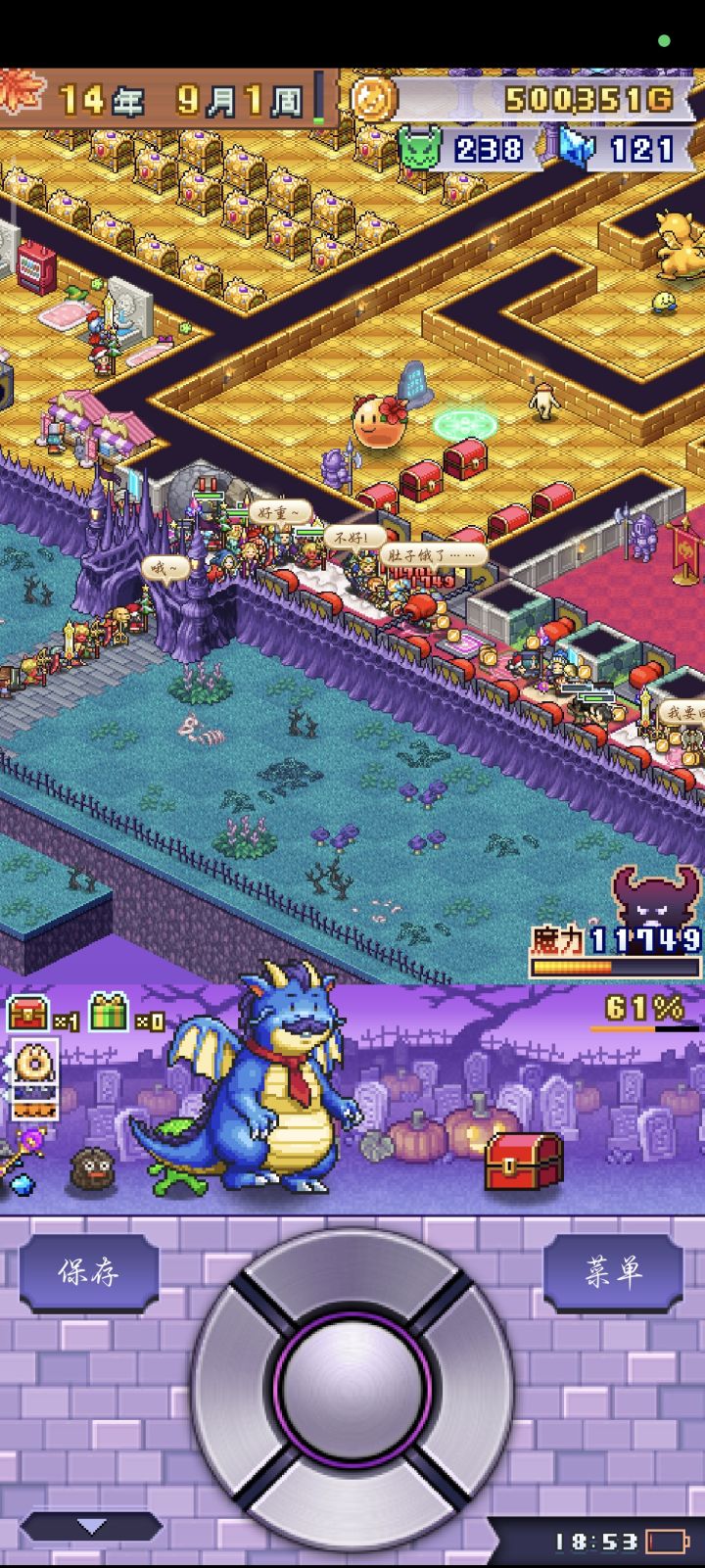 一款不需要动脑子但是挺累的打怪类开罗游戏,累在要不断继承重开档,因为每结算一次会多给一个开罗雕像+多继承一个新魔物。这是第二款能让我重开档的开罗游戏,第一款是初代赛车物语,当时是为了爆金光改造零件。因为我不玩陷阱流,所以布局最重要的就是多分房间、多造岔路。每个关键节点房间放一只大佬,虽然冒险者会乱走导致没法靠一只拦下所有,但每一个跟它对上眼的孩子都活不过一集,这就很好。虽然后期冒险者人数巨多,但