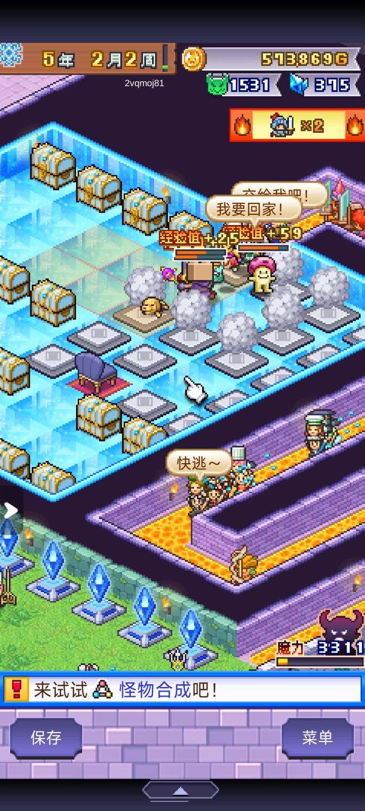 一款不需要动脑子但是挺累的打怪类开罗游戏,累在要不断继承重开档,因为每结算一次会多给一个开罗雕像+多继承一个新魔物。这是第二款能让我重开档的开罗游戏,第一款是初代赛车物语,当时是为了爆金光改造零件。因为我不玩陷阱流,所以布局最重要的就是多分房间、多造岔路。每个关键节点房间放一只大佬,虽然冒险者会乱走导致没法靠一只拦下所有,但每一个跟它对上眼的孩子都活不过一集,这就很好。虽然后期冒险者人数巨多,但