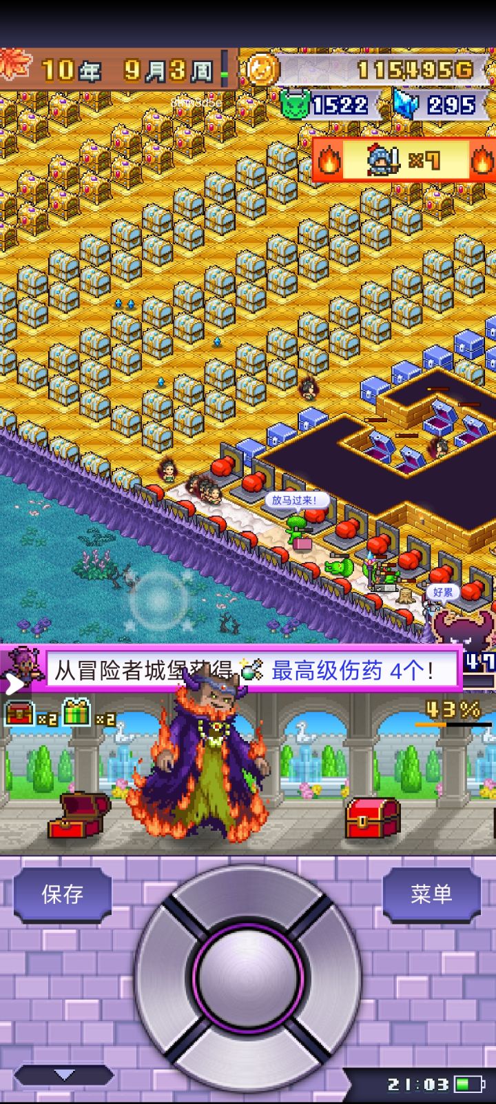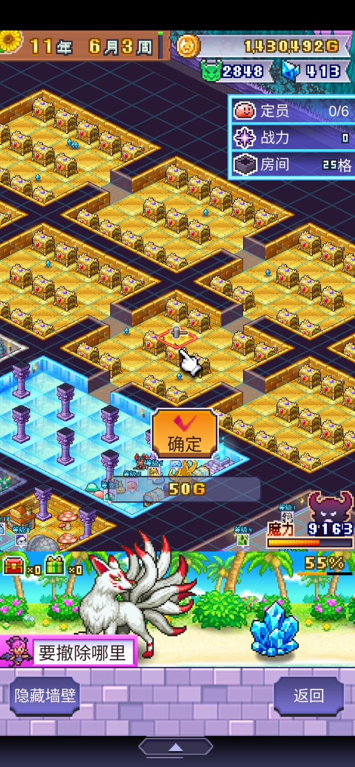 一款不需要动脑子但是挺累的打怪类开罗游戏,累在要不断继承重开档,因为每结算一次会多给一个开罗雕像+多继承一个新魔物。这是第二款能让我重开档的开罗游戏,第一款是初代赛车物语,当时是为了爆金光改造零件。因为我不玩陷阱流,所以布局最重要的就是多分房间、多造岔路。每个关键节点房间放一只大佬,虽然冒险者会乱走导致没法靠一只拦下所有,但每一个跟它对上眼的孩子都活不过一集,这就很好。虽然后期冒险者人数巨多,但