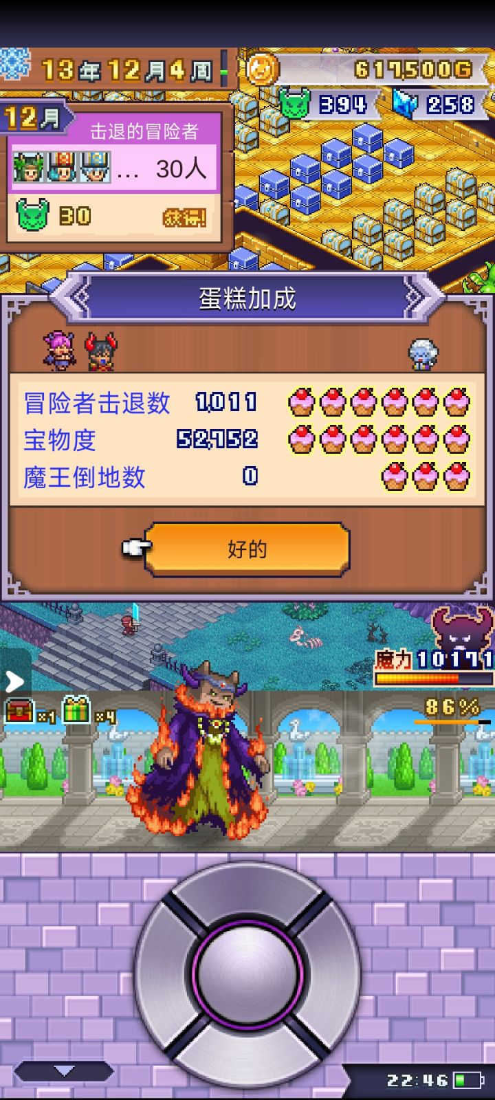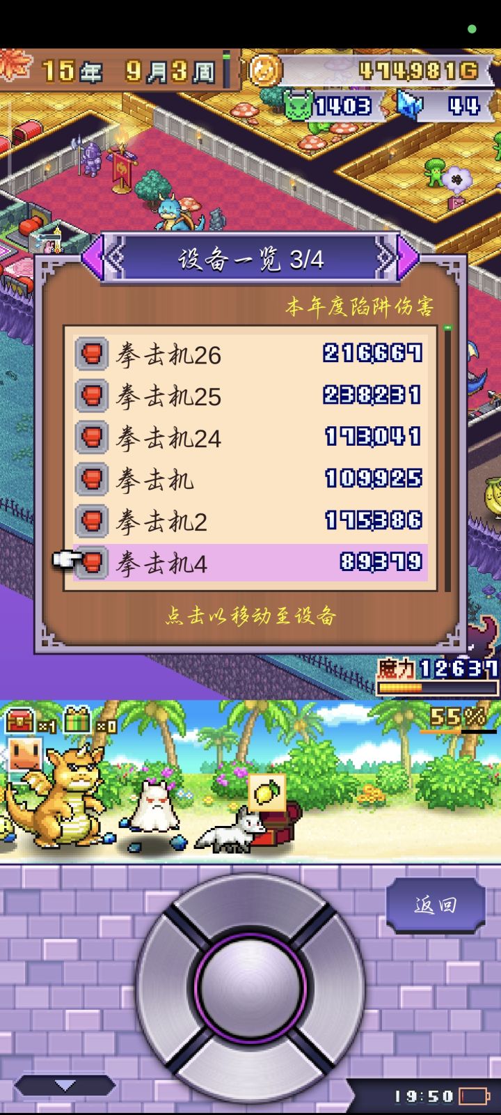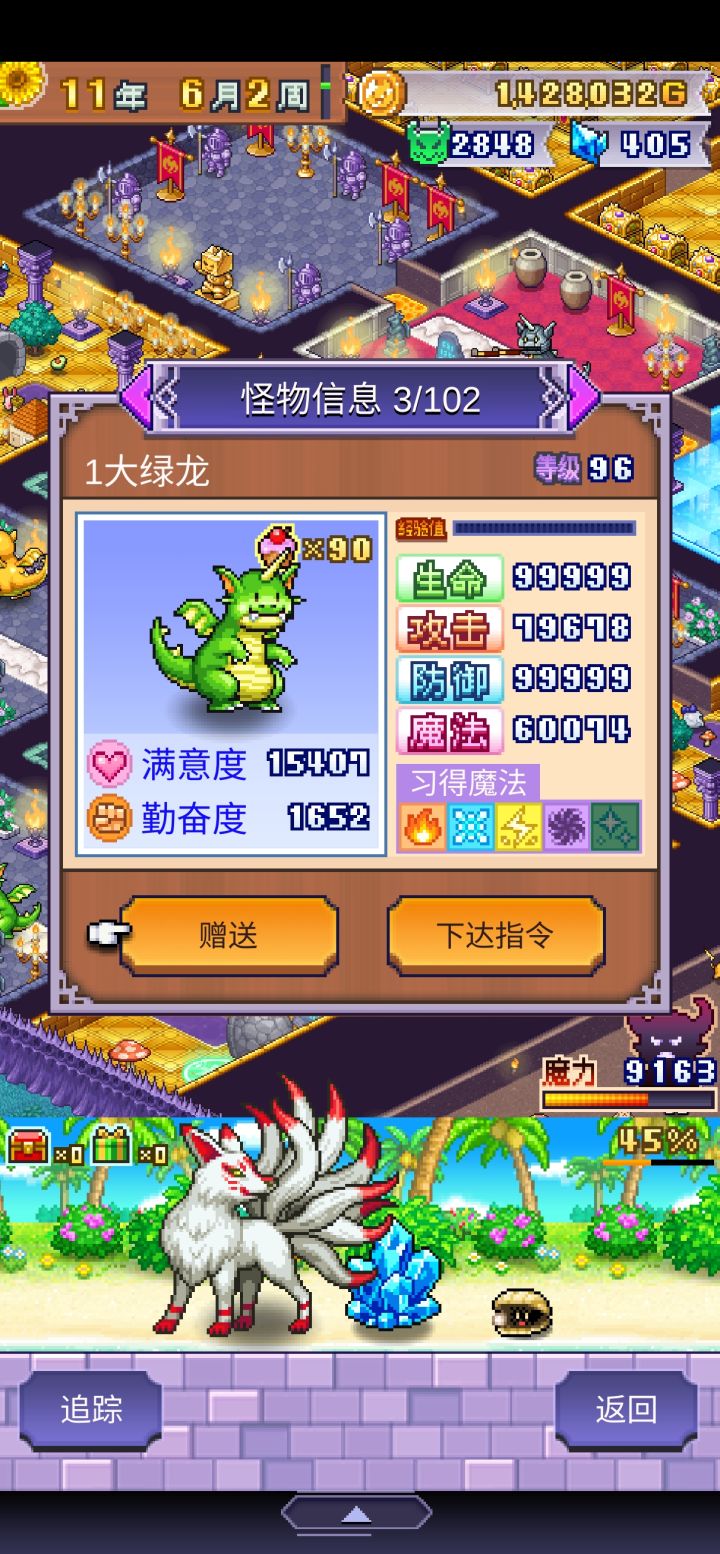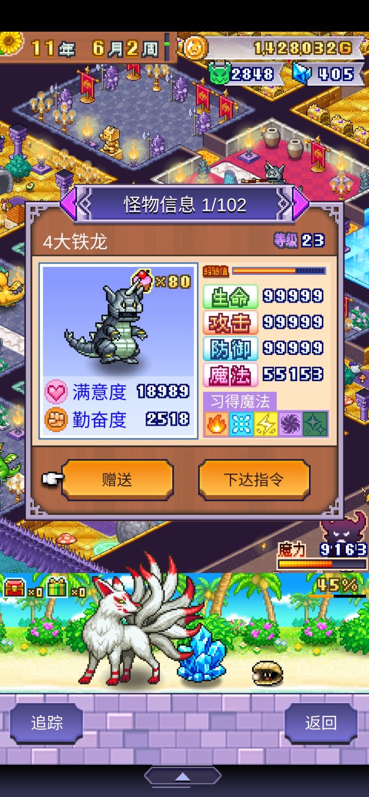 内容太少了,越到后面越无聊,除了前期发育的时候感觉有新意,后面冒险者实在太多了,排成串不间断,你单上魔物100%不可能打过的(因为不是有怪物在那里,后面的冒险者就进不来,一个怪只能应对几只,其他的全部跑到后面去了),只能玩陷阱。所以一点怪物养成体验都没有,前期喂食品属性加的少,后期每次清空商店就能喂两三百个道具。那个魔王更是没做,纯摆设来的,只有前期能扛个几年,后面只能关在房间(因为魔王不能给道具