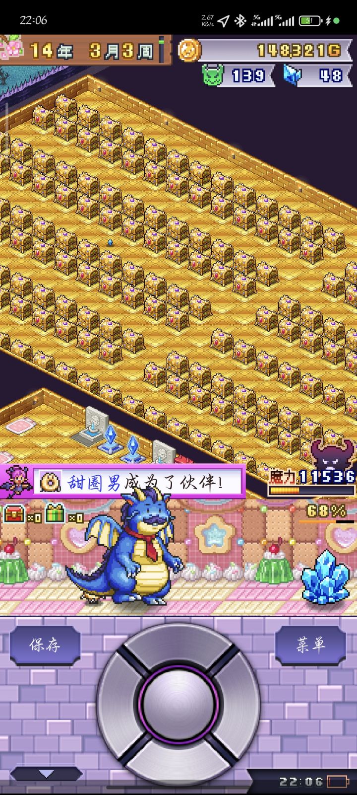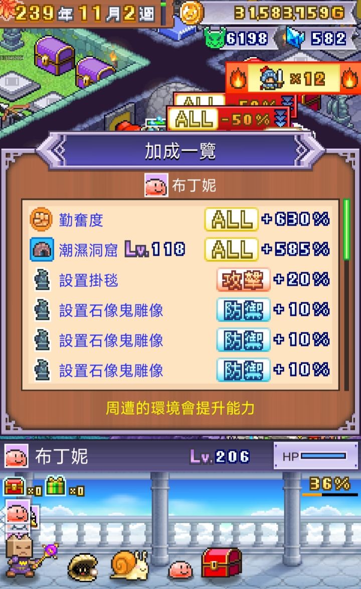 一款不需要动脑子但是挺累的打怪类开罗游戏,累在要不断继承重开档,因为每结算一次会多给一个开罗雕像+多继承一个新魔物。这是第二款能让我重开档的开罗游戏,第一款是初代赛车物语,当时是为了爆金光改造零件。因为我不玩陷阱流,所以布局最重要的就是多分房间、多造岔路。每个关键节点房间放一只大佬,虽然冒险者会乱走导致没法靠一只拦下所有,但每一个跟它对上眼的孩子都活不过一集,这就很好。虽然后期冒险者人数巨多,但