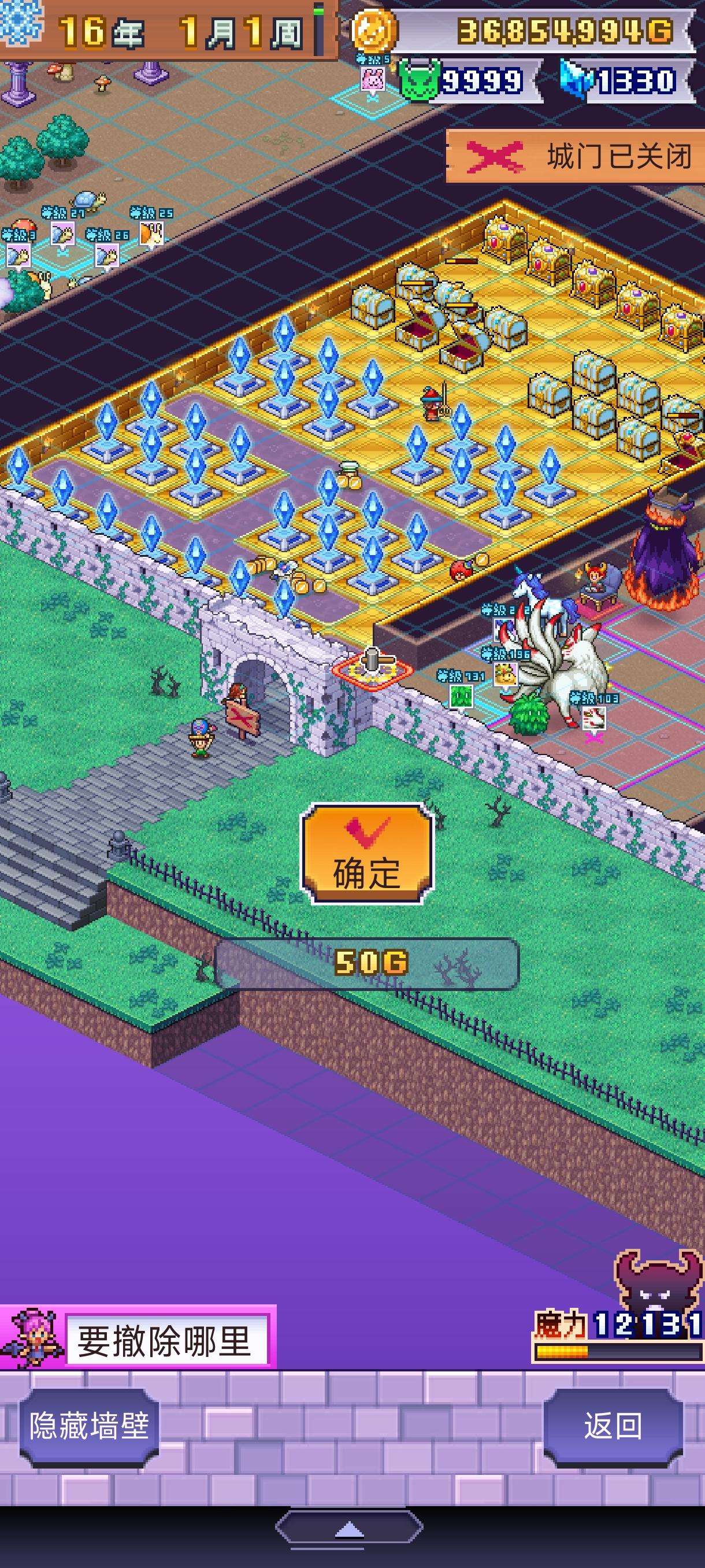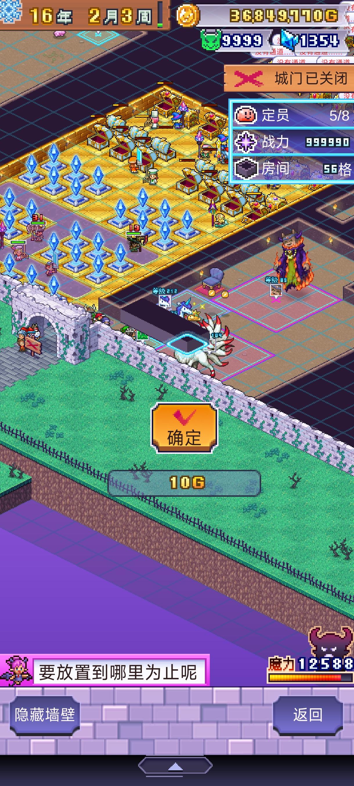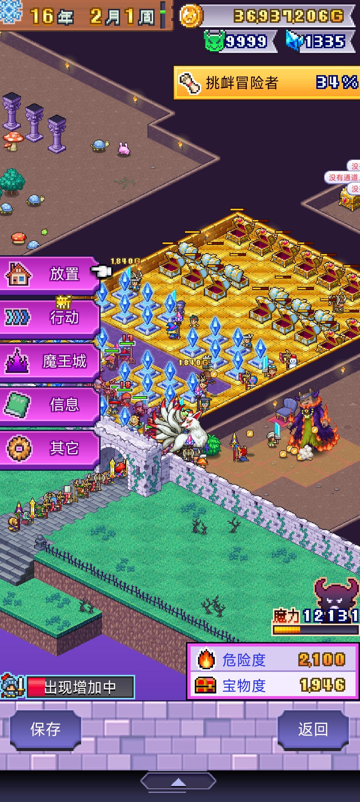 因为危险度越高,冒险者越强,我们只要控制危险度不增加就可以随便打。开宝箱和活着出去可以减危险度左边房间赚钱和减危险度。右边刷击败数,2000危险度能满足明每年1000的要求,如果危险度会涨就加3格墙(如图2)