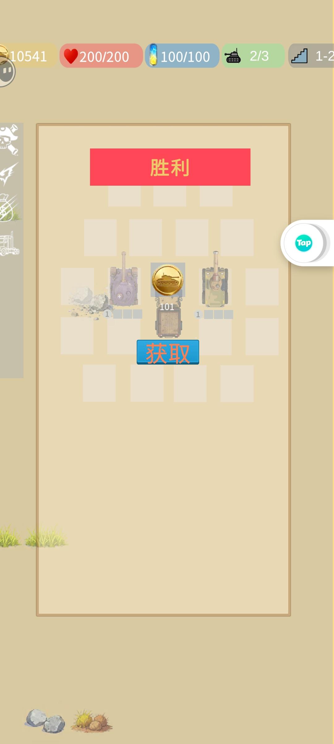 分难度进行游戏,大部分养成都在局内进行,相同的坦克可以二合一升级提升战斗力,上阵数量也会随着关卡推进逐渐增多,也可以看广告直接增加上限。装备需要花费金币购买,除了在商店里买,普通关卡出现有随机性。