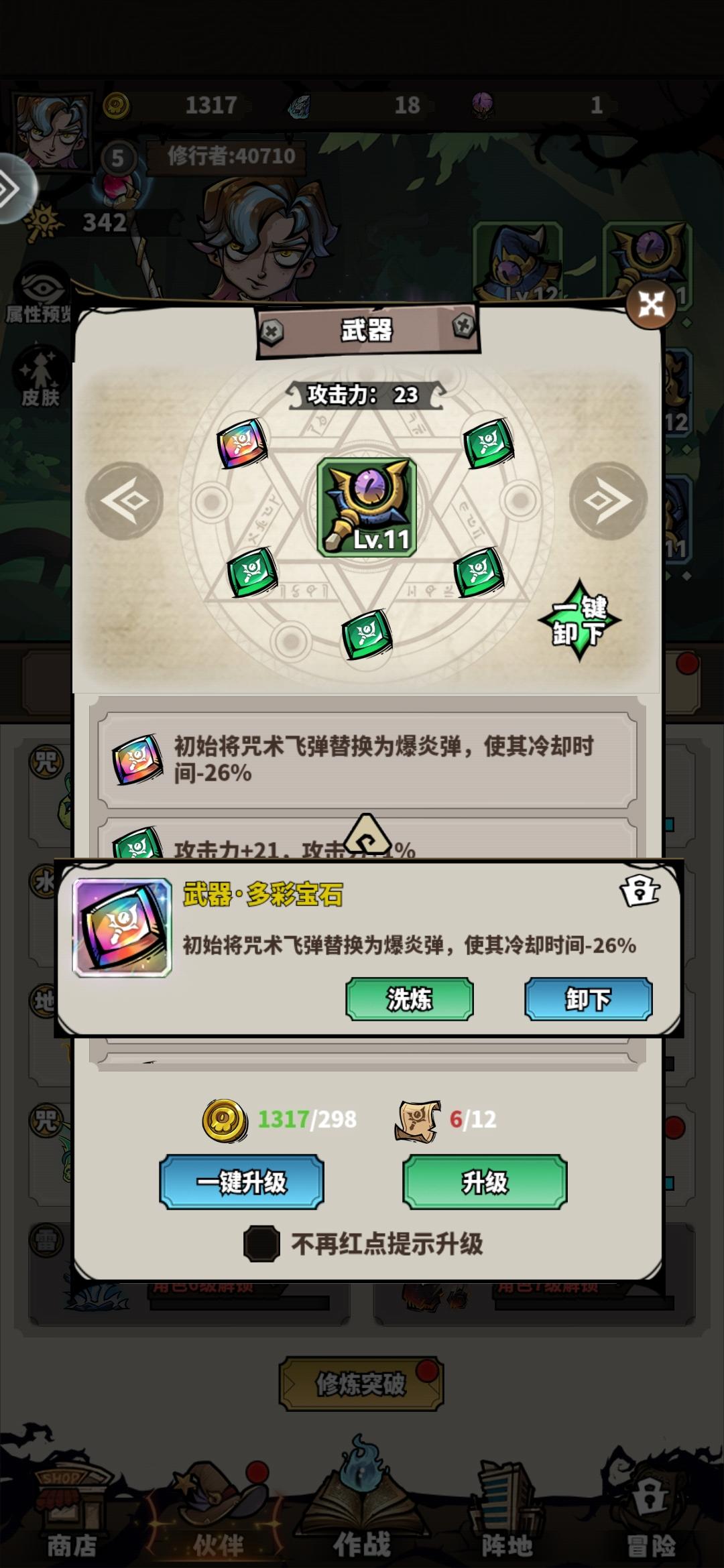 玩了几个小时感觉这游戏玩法简单,刷怪挺爽,广告不多,不过升级有点慢,目前刚到7级,还有好多技能没解锁。现在用的最多的套路是咒术,因为普攻是咒术球,升级有多重有分裂,射程最远又是普攻,技能点给它不会亏,另外同系的咒术连射打大怪很好用,所以前期主升这两个技能很舒服。但打到十关左右开始乏力了,咒术球提升速度跟不上关卡,用它杀怪太慢等级升不起来,换了几个其他套路,发现其实技能固定两三个就行,等级提起来最