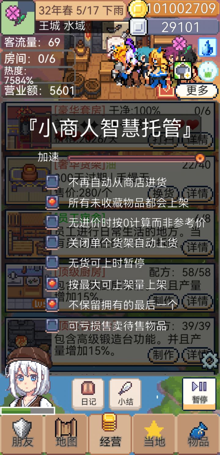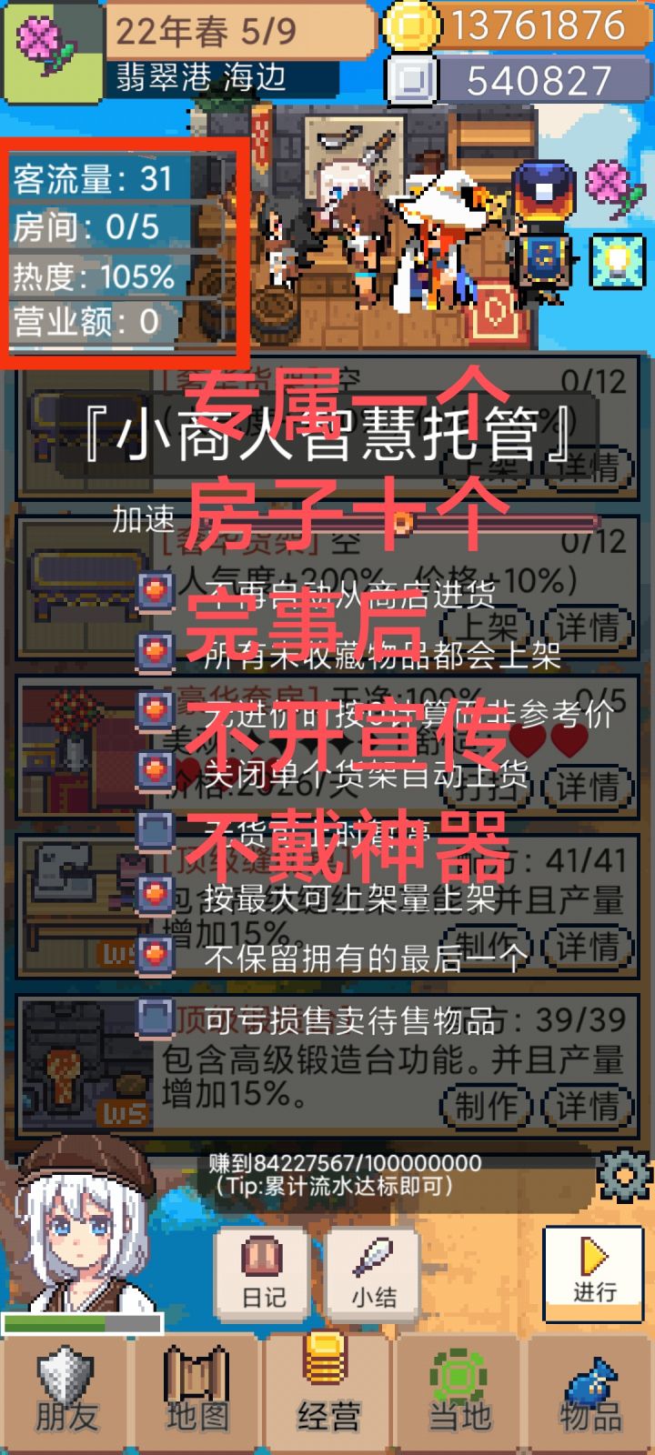 1.在经营页面中点击下图所示区域可以进入挂机托管系统(注意:1.1按照上述选项设置托管系统时,把自己需要保存的物品提前收藏好[技能点数,宝箱,需要的食物,武器装备如果不收藏也会被上架]1.2托管系统会优先自动在当地市场进货并售卖,自己操作买的商品将在托管系统无法进货后再售卖1.3当角色前往一个地方后,首先暂停查看当地市场是否有需要的东西,将它们购买收藏以后再进入托管系统[满加速的托管采购和