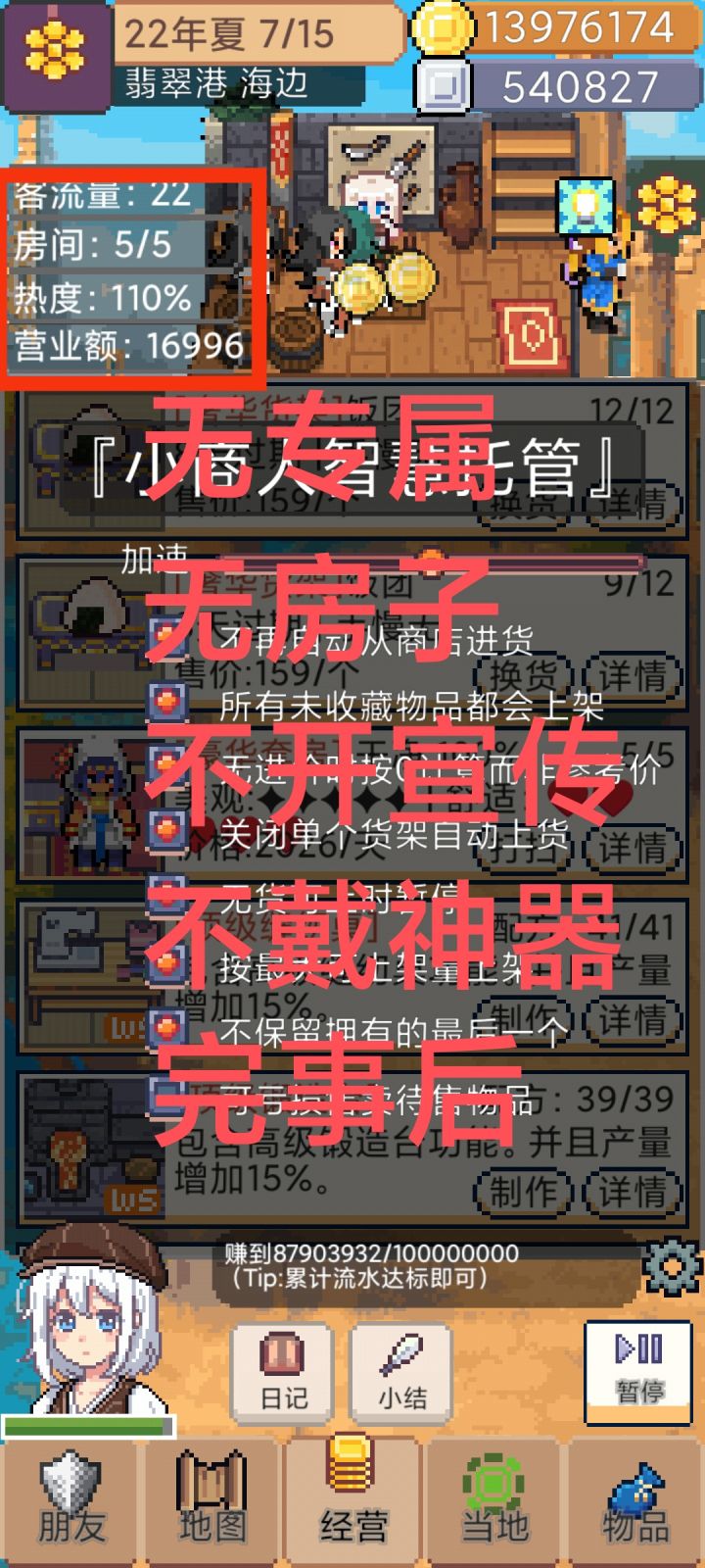 完成了所有任务,凑齐了6个伙伴,手捏9个神器,驾着一辆马车(这么大明明是列车)于是闲来无事写点什么。记得最初注意到没钳还是偶然在tap刷到种田高手,二头身像素小人合我胃口,长线经营就能变成大数字的游戏,就关注了。直到今年年初,没钳发行了个新游戏,那必须尝尝咸淡,上手后发现整个游戏的设计是《种田高手》的升级款,特别是商店托管很省心。经历了20+小时的货贩子生涯(交易所进货,零售卖出