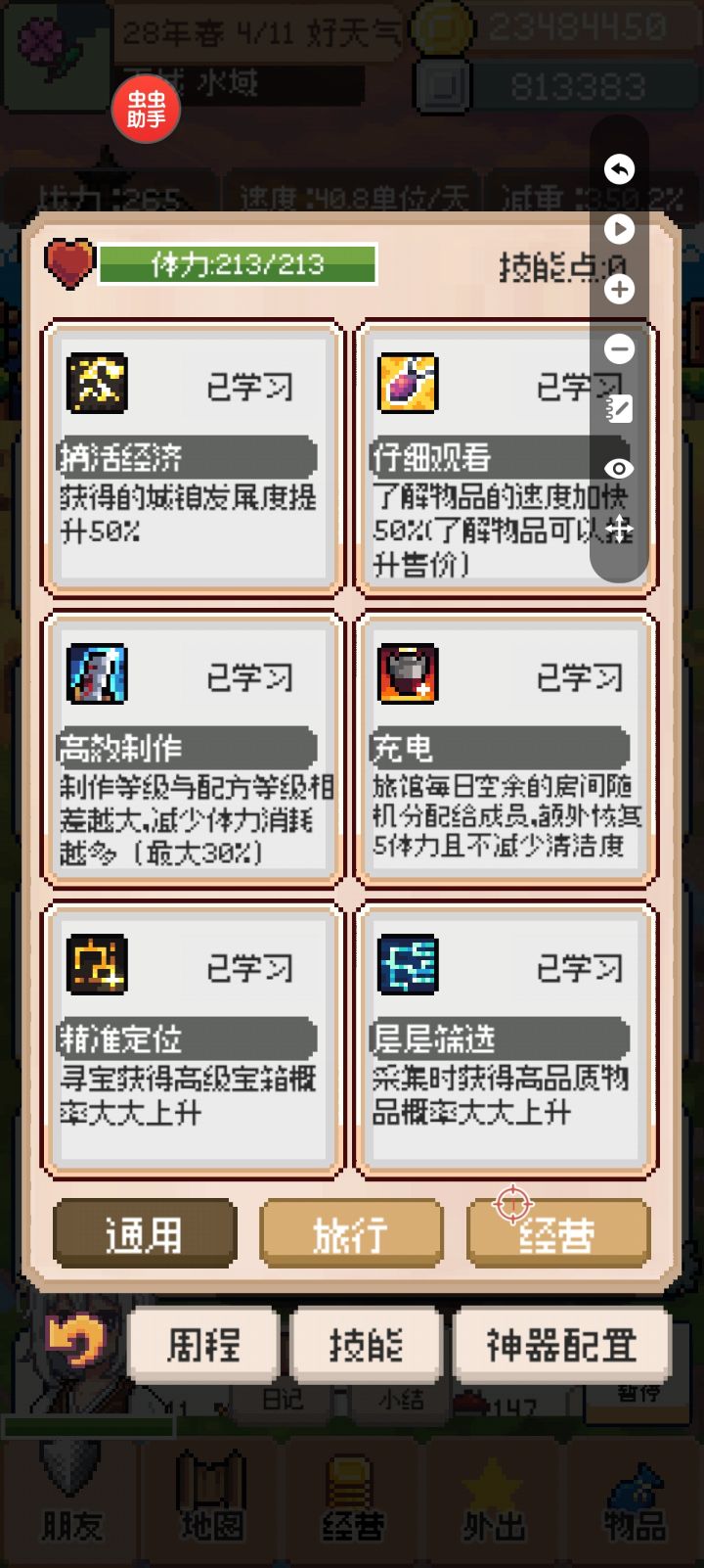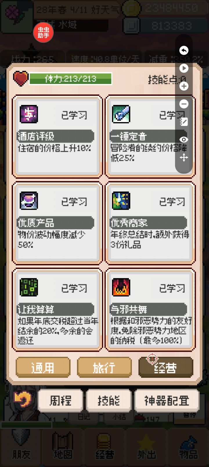 1.在经营页面中点击下图所示区域可以进入挂机托管系统(注意:1.1按照上述选项设置托管系统时,把自己需要保存的物品提前收藏好[技能点数,宝箱,需要的食物,武器装备如果不收藏也会被上架]1.2托管系统会优先自动在当地市场进货并售卖,自己操作买的商品将在托管系统无法进货后再售卖1.3当角色前往一个地方后,首先暂停查看当地市场是否有需要的东西,将它们购买收藏以后再进入托管系统[满加速的托管采购和