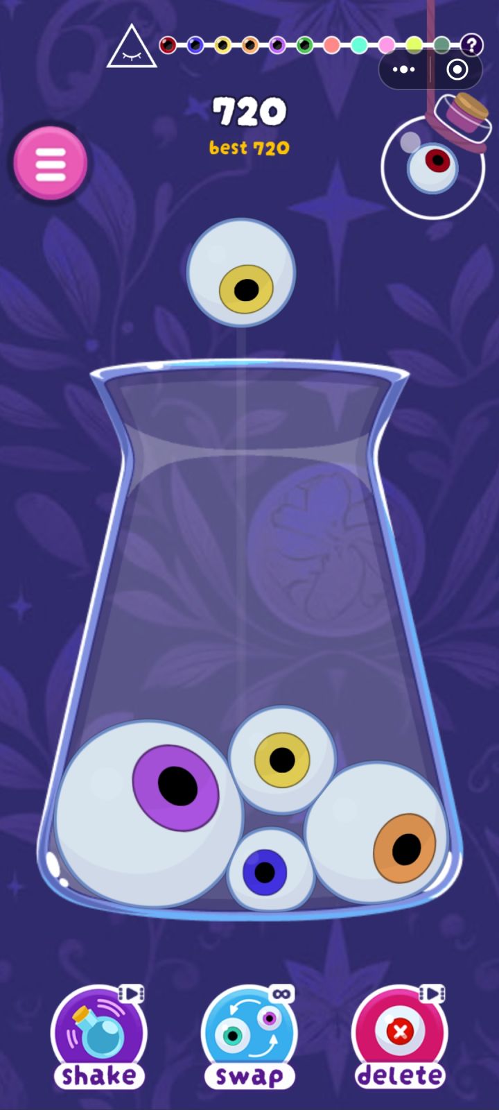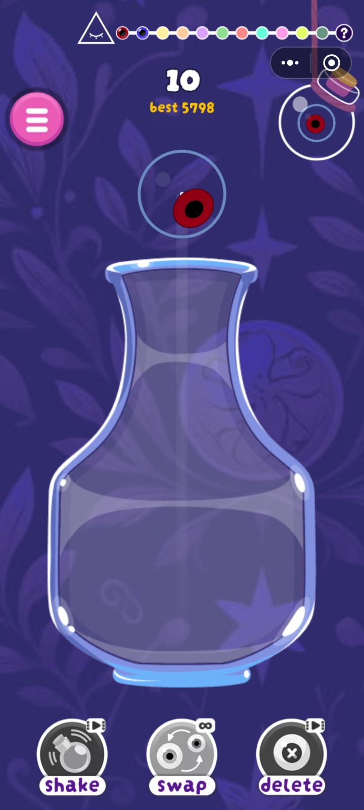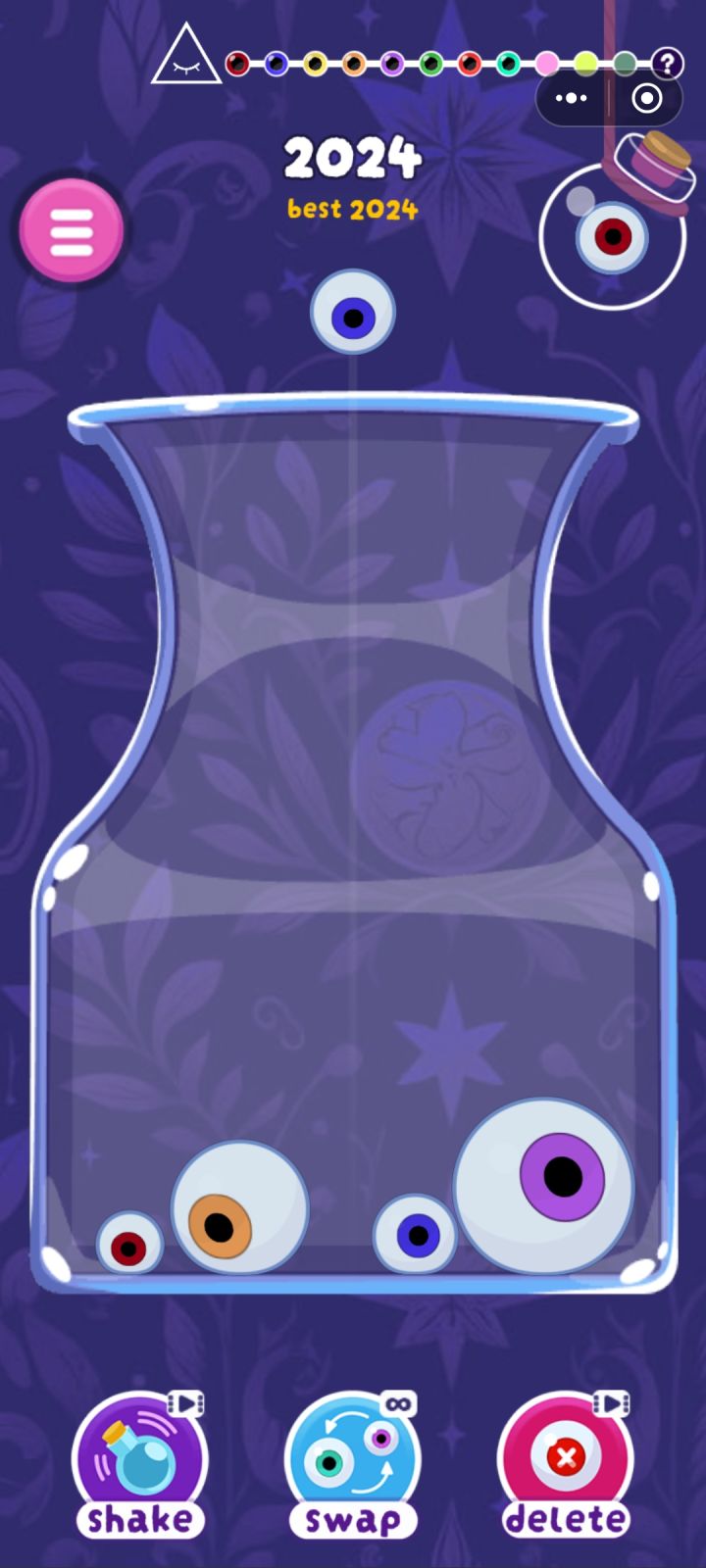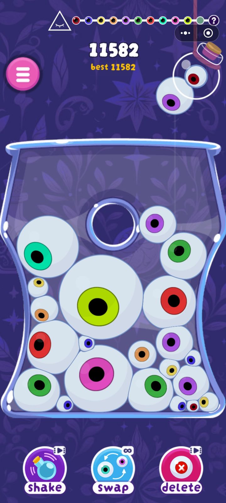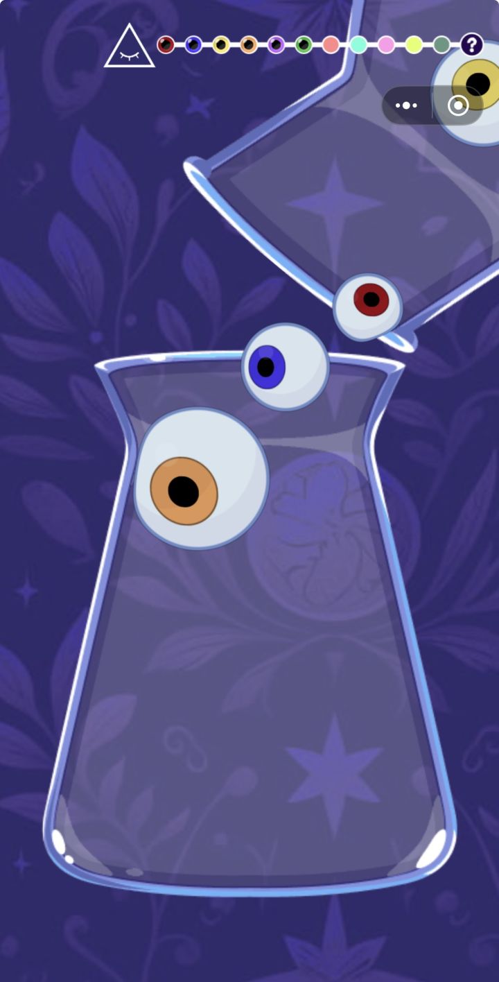 游戏中玩家需要在不同形状大小的瓶子中填充不用大小的眼珠,每解锁一个新眼珠,玩家会到达一个新关卡,剩余的眼珠会倒进下一个瓶子中,瓶子的形状很大程度上影响了游戏的难度,游戏的技能有三种,一个是晃动几下瓶子,一个是和和下一次的眼珠交换顺序,还有一个是删除瓶子内的一个眼珠,游戏虽然有这些看似无敌的技能,但这些技能都需要时间去冷却。游戏的最终是合成彩虹眼珠,合成后游戏会进入无尽模式,玩家可以不断累计分数合成彩虹眼珠,直到瓶口无法再堆积眼珠为止。游戏的难度之所以并不只是瓶子形状导致,游戏中始终围绕最低级的眼珠进行合成也是其中一条原因,在合成彩虹眼珠的过程中依然有不少最低级的眼珠进行合成,这就导致游戏中眼珠的合成需要不少时间,也跨越了很多阶段。