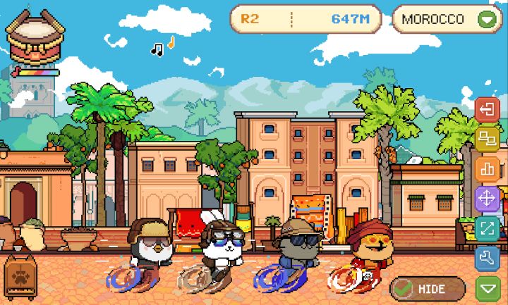 如果完全不使用键盘或者鼠标,游戏左上角的那个代表移动的鼓声也不会敲起来,小动物们也就停下来了。然后游戏内还有个简单的统计,会统计移动的距离,除此之外在没有什么了。无非就是一些和挂机有关的设置,改变一下白天黑夜啥的,再或者是完全隐藏游戏的背景就剩下几个小动物在那狂奔的样子,如果主动和小动物交互的话,也会说一些简单的话或者使用表情符号,十分的有趣。