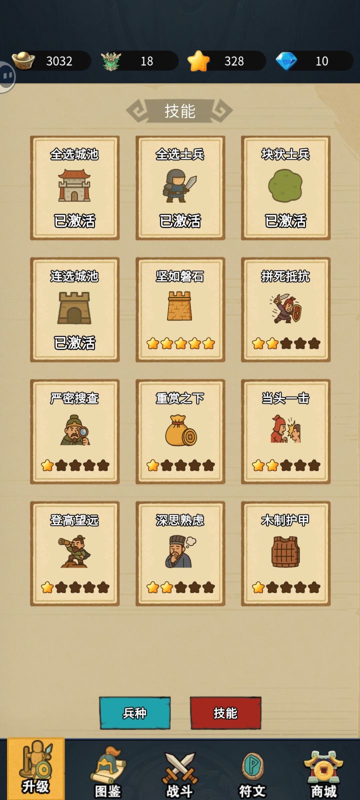 游戏算是挺有意思的小游戏——这种简化了的rts游戏有自己的乐趣。游戏玩法没问题,但数值还需要打磨一下。比如某些关卡难度陡然拔高到看很久广告才能过——55.56关。比如小前几种兵种换皮肤有技能有数值变化,后面的兵种换皮肤没有变化。步兵加一级防御加5,后面的兵种加0.02/0.05。我怀疑是多了百分比符号。再比如很多符文二级三级数值一样,升级等于白升。图鉴里明明有但是实战里没有的兵种。