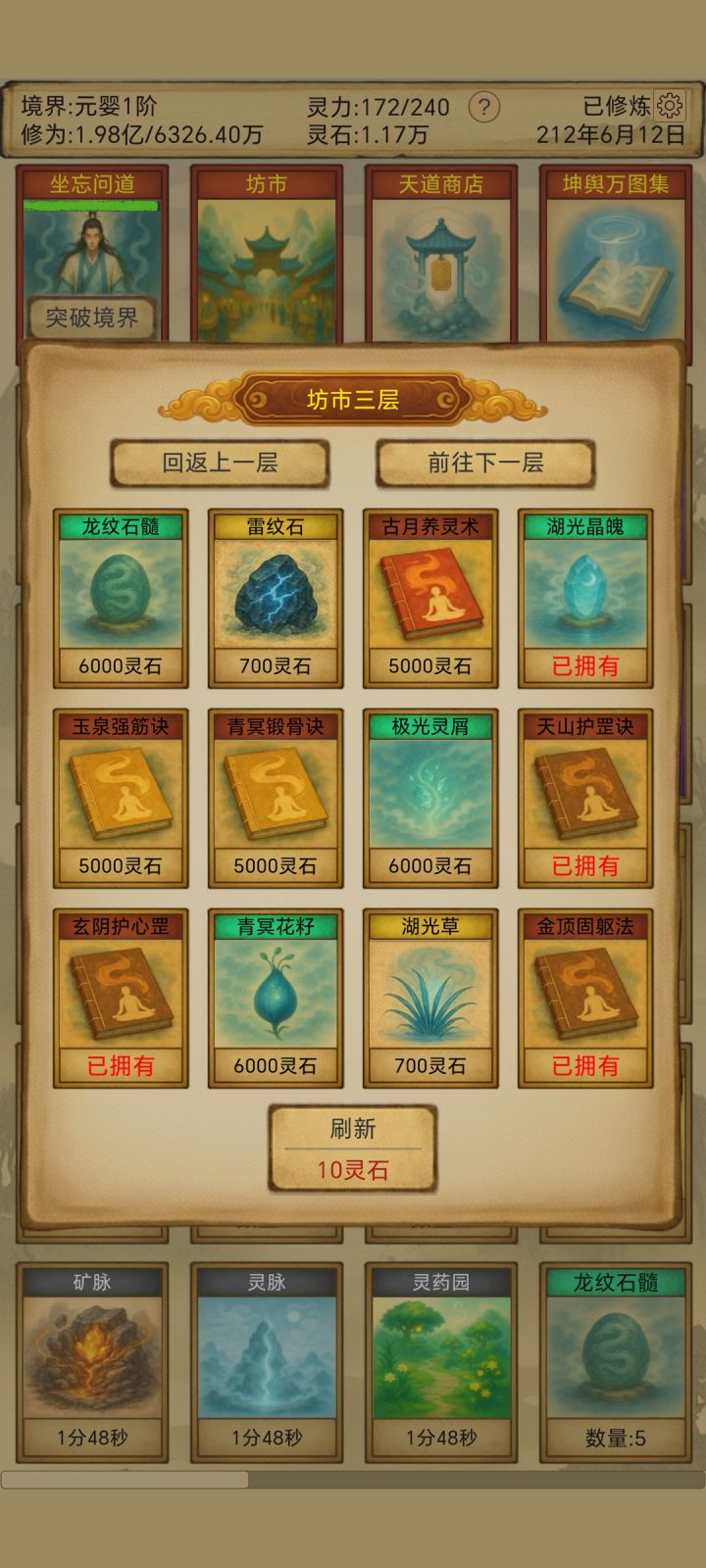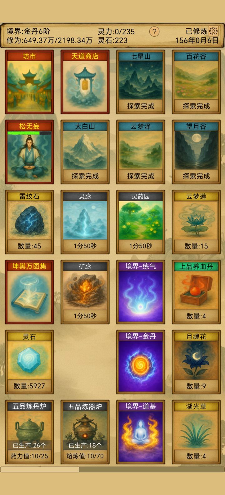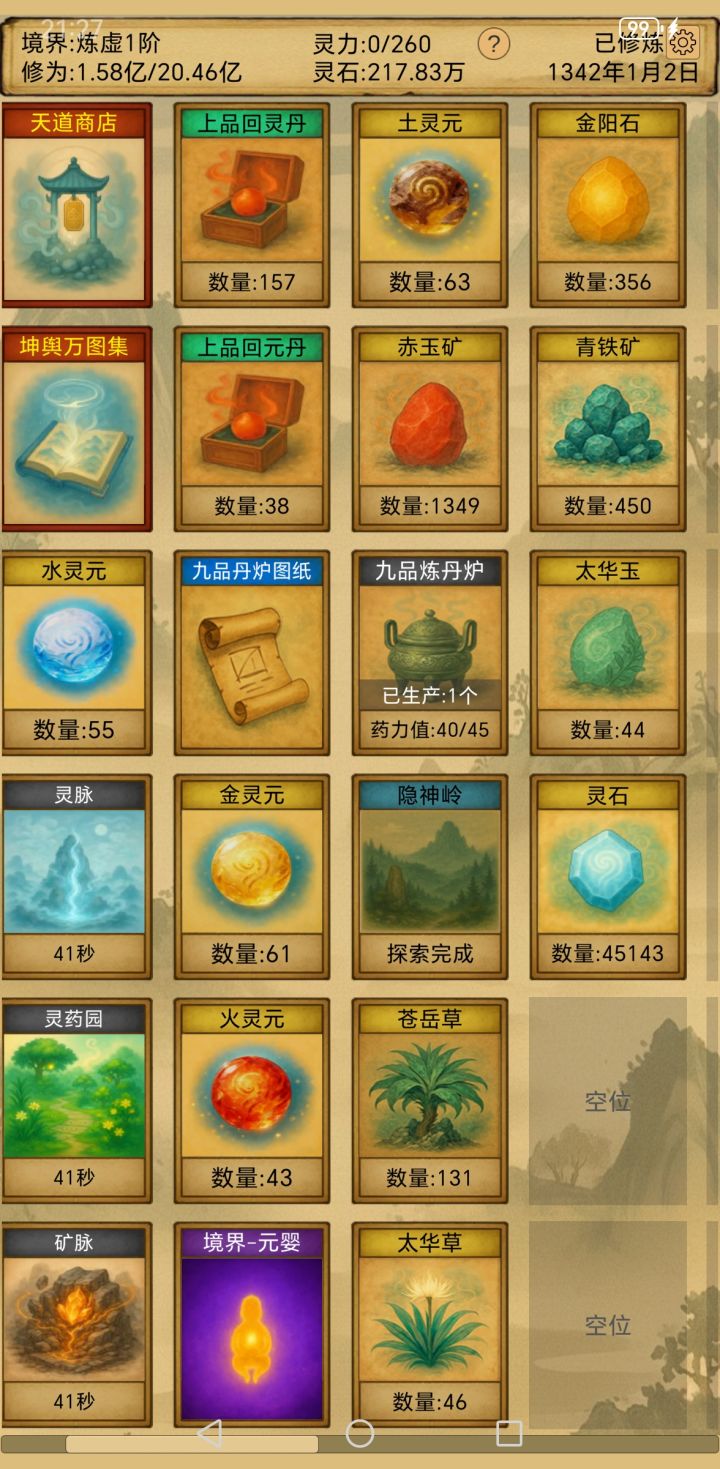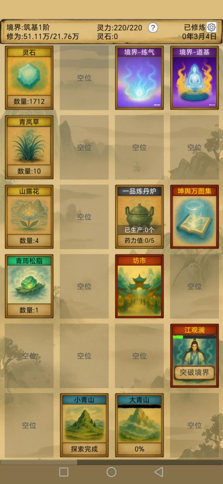 玩了两天,bug有空位放不了东西,体力不随时间恢复。建议探索地点可以按顺序叠放,现在这样地方占用太多,还乱,探索地点可以显示探索到的资源。不同丹药需要不同药草,不然弄这么多草药全部浪费