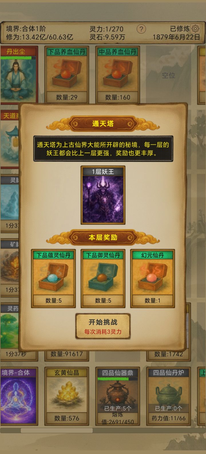 诸位道友:自登临仙界,修炼数载,而今道行已臻合体之境。天机感应,新的试炼之途已现 —— 通天塔,明日开塔迎战。此塔之中,镇有上古囚妖,凶威赫赫,非等闲可敌。然凶险之下,亦伴丰厚机缘,法宝、灵材、秘卷皆藏其间,静待有缘人取。此番非仅试炼,更为问道。愿诸君以合体之姿,叩问通天之途。塔门已开,静候君临。——《卡牌修仙:仙缘》修行司 谨启