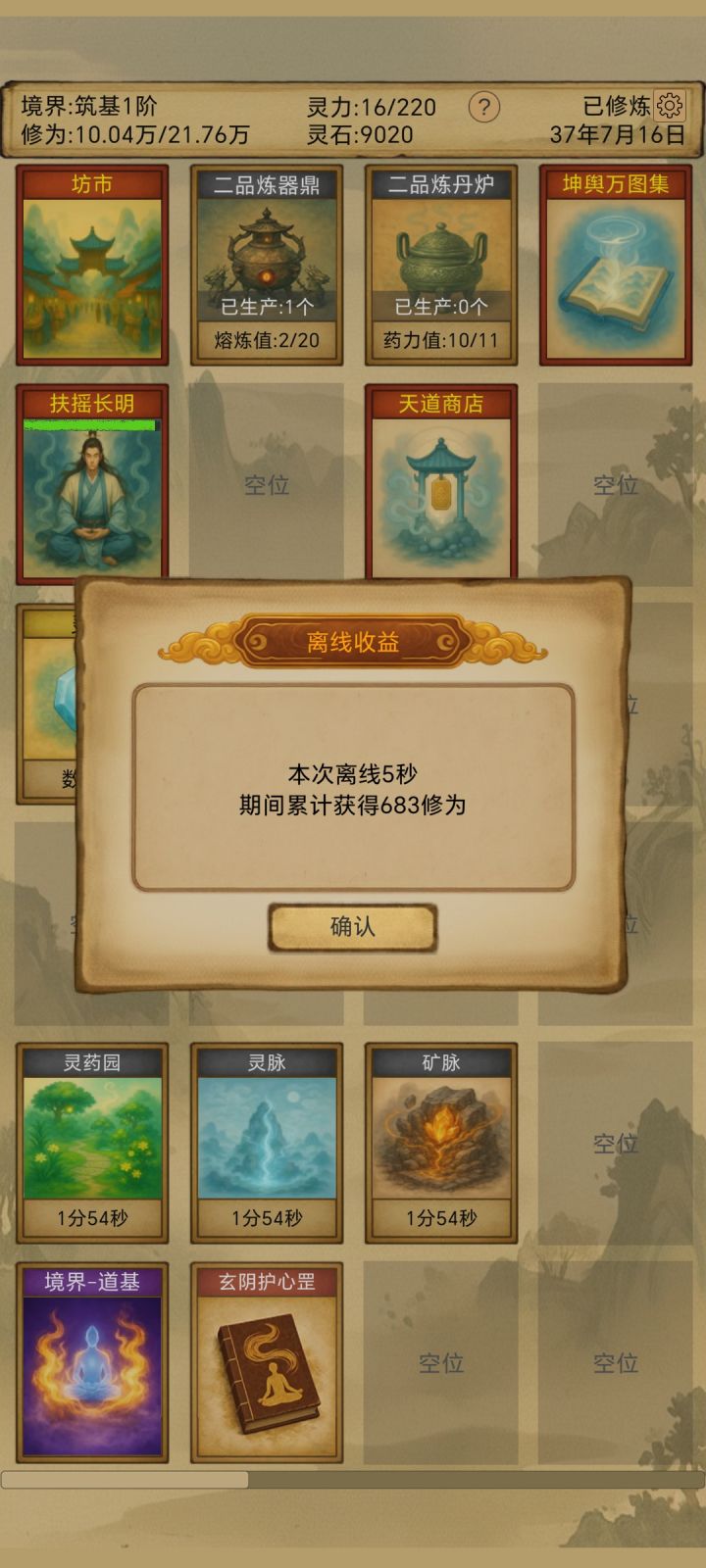 开局先把灵力用完再突破,快速推图解锁灵脉、药园和矿脉。没灵力和灵石后,神游太虚。去手机设置,时间设置,关掉自动确定日期和时间,然后往后调12小时,再上线领取药园(道友,请开启你的小绿瓶挂),买个十来个丹炉,大练仙丹。灵脉领的灵石可以去坊市买修为药吃,破境就像坐飞机