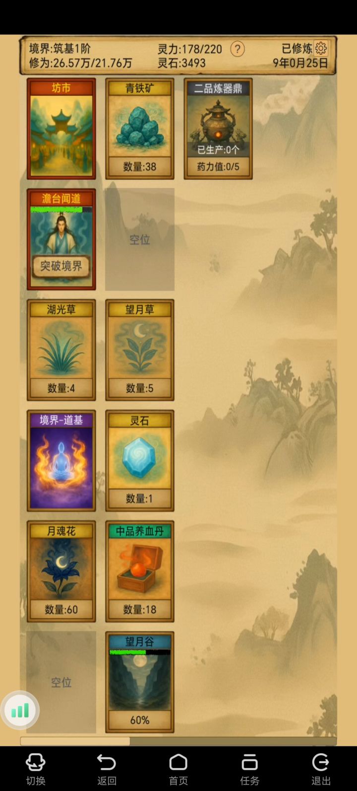 玩了两天,bug有空位放不了东西,体力不随时间恢复。建议探索地点可以按顺序叠放,现在这样地方占用太多,还乱,探索地点可以显示探索到的资源。不同丹药需要不同药草,不然弄这么多草药全部浪费