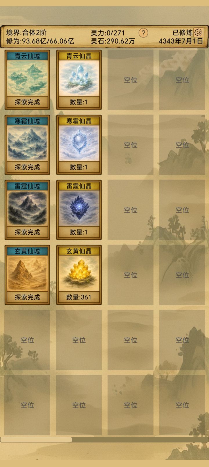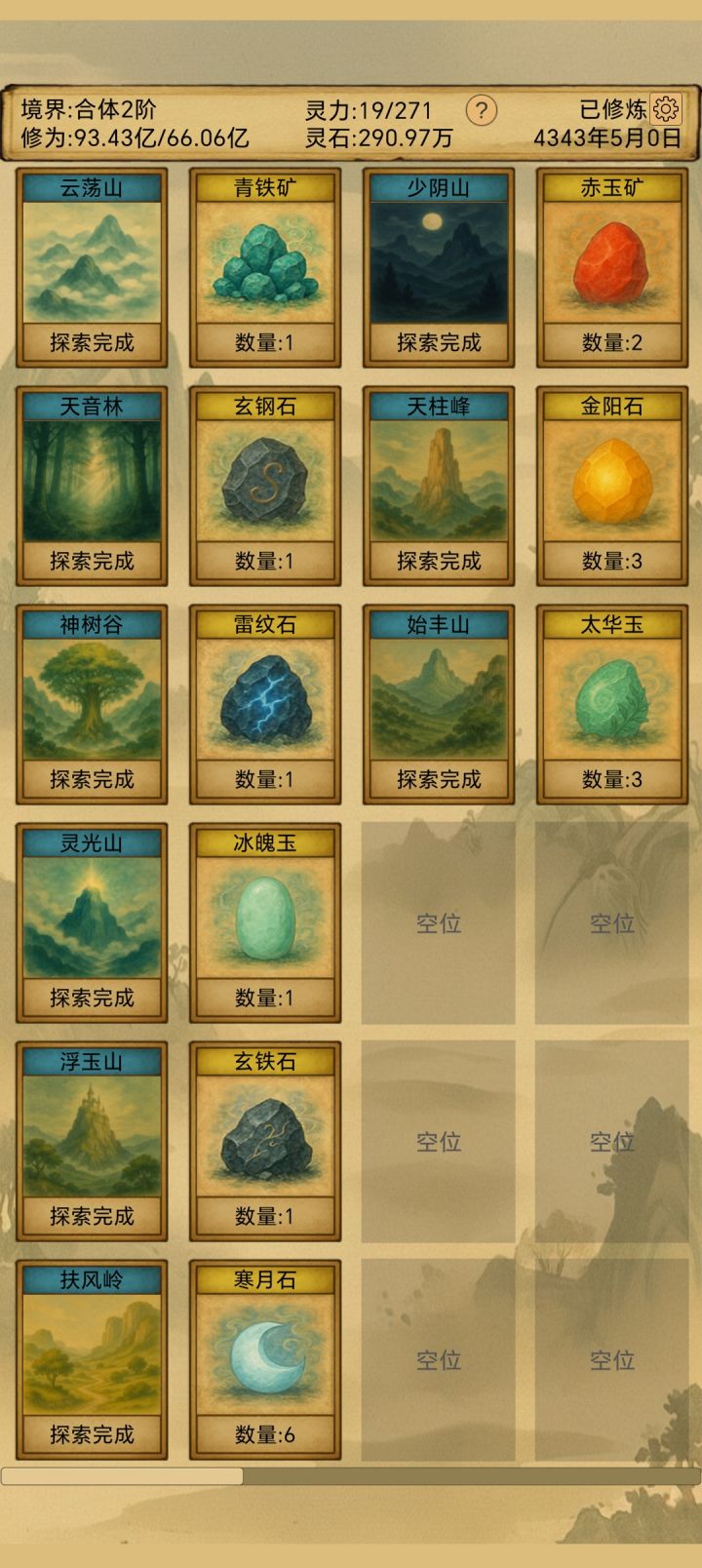 云荡山—青铁矿天音林—玄铁石神树谷—雷纹石灵光山—冰魄玉浮玉山—玄钢石扶风岭—寒月石少阴山—赤玉矿天柱峰—金阳石始丰山—太华玉青云仙域—青云仙晶寒霜仙域—寒霜仙晶雷霆仙域—雷霆仙晶玄黄仙域—玄黄仙晶