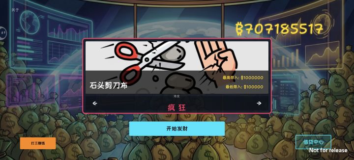 目前的石头剪刀布十分简易,具有普通水平的思维能力和简易的股票知识即可大赢特赢,需要注意的是,要留足足够的本金留约25%最佳,毕竟这个和股票一样具有随机性,要玩下去重要的不是赚多少而是活下去继续玩,最简单的赚钱方法就是每轮时停买卖时看哪个阵容数量多得离谱了,买它对手就行了,剩下的就是运气了