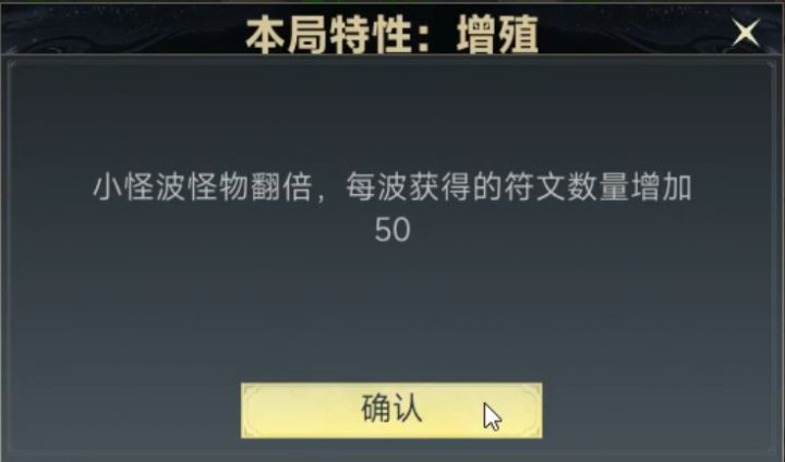 特效描述:小怪波怪物翻倍,每波获得的符文数量增加50小怪波值得是除了5、10波以外的波次。比较适配职业是符咒师,符咒师可以更快的累积启动资金,快速过渡到后期吃利息的阶段。符咒师本身范围伤害充足,也比较擅长应付怪群。可以用寒冰系天赋来提高清怪的速率;也可以选择疾风天赋,在被包围时用翻滚脱离怪群