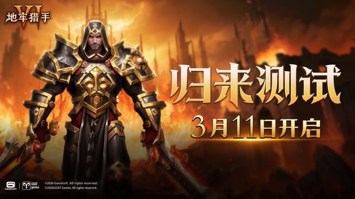 十年等待,今朝猎场再启。感谢所有赏金猎人对《地牢猎手6》的持续关注与期待。经过漫长准备,Gameloft全球唯一正版授权续作《地牢猎手6》,今日正式宣布【归来测试】将于2026年3月11日10:00正式开启!🎮测试信息🎮测试时间:2026/3/11 10:00---3/18 23:59测试平台:安卓测试类型:限量删档不计费测试「归来测试」中的体验内容均为测试开发中的版本,不代表游戏最终