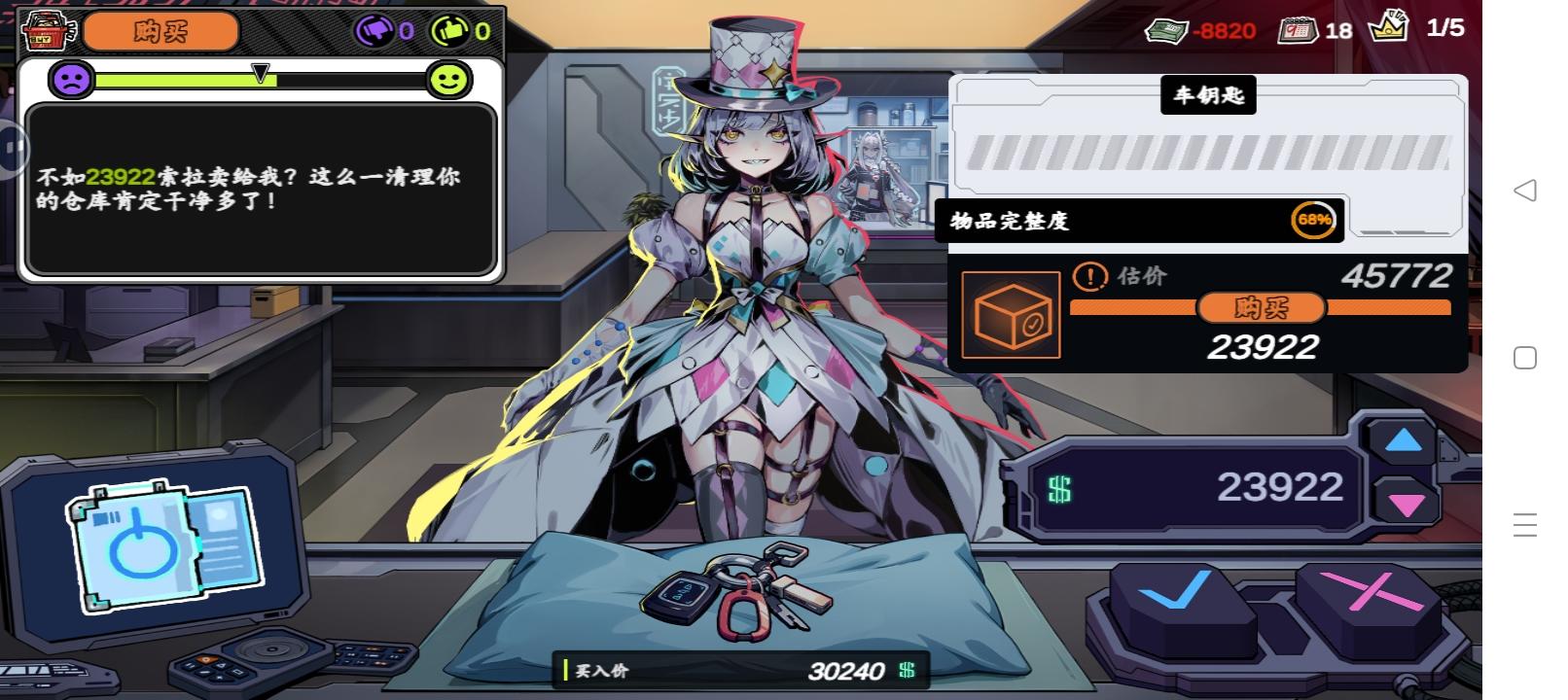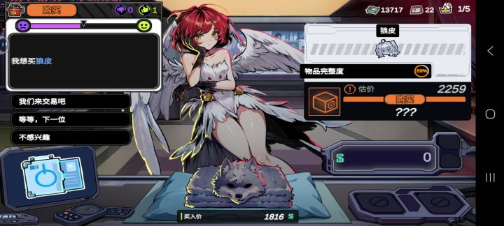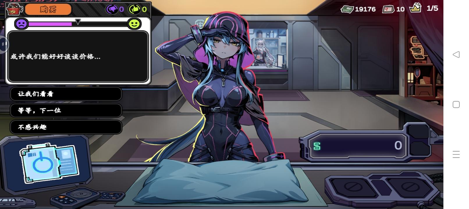 二次元画风,带点赛博朋克和魔幻题材混搭的效果,界面结构很清晰,UI品质还可以。二次元角色都是静态图,剧情也缺乏表情变化,只能从文字去脑补角色形象变化。买卖行为只有一字之差,在右侧有不同颜色标示,仔细看的话不会认错。基本意思表达很清晰,容易理解。