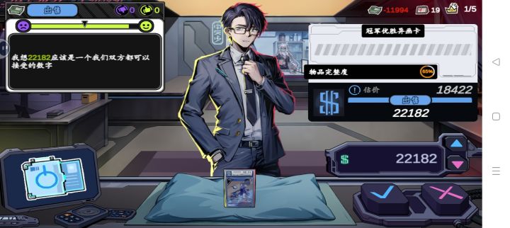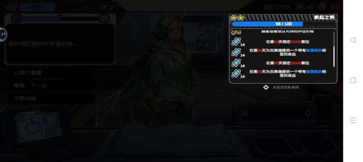 店铺模拟经营类游戏,设定有点像武器店物语,又是一个来讨债的吸血鬼,和赛博题材格格不入,突出剧情的诡异。店铺经营需要盈利来满足高额的债务目标,可以在右上角查看,有些时候有特殊词条物品也行,有点拼运气。新手引导非常详细,每一处细节介绍得很清晰,上手不难。