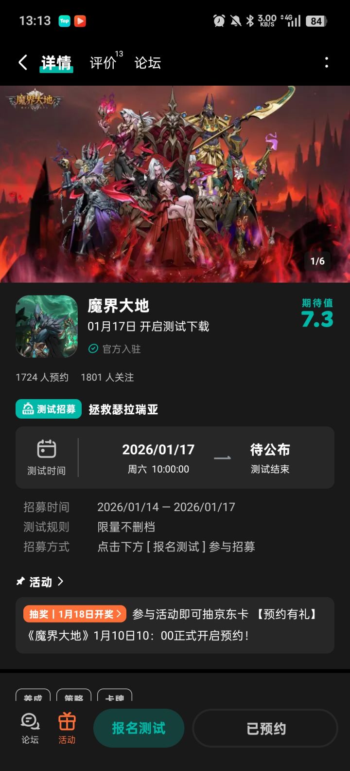 原本平静的瑟拉瑞亚,魔族邪神卷土重来,而你为守护瑟拉瑞亚,来到了《魔界大地》。>>>点击即可预约【参与方式】1.关注《魔界大地》且发新帖晒截图2.在本帖下方评论区分享发帖链接即可【活动时间】即日起~2026年1月18日 23:59【活动奖励】京东卡,共10份【注意事项】1.仅有符合活动要求的评论会被视为有效参与活动,若回复内容未能满足活动要求,则被视为无效回复,取消获奖资格。2