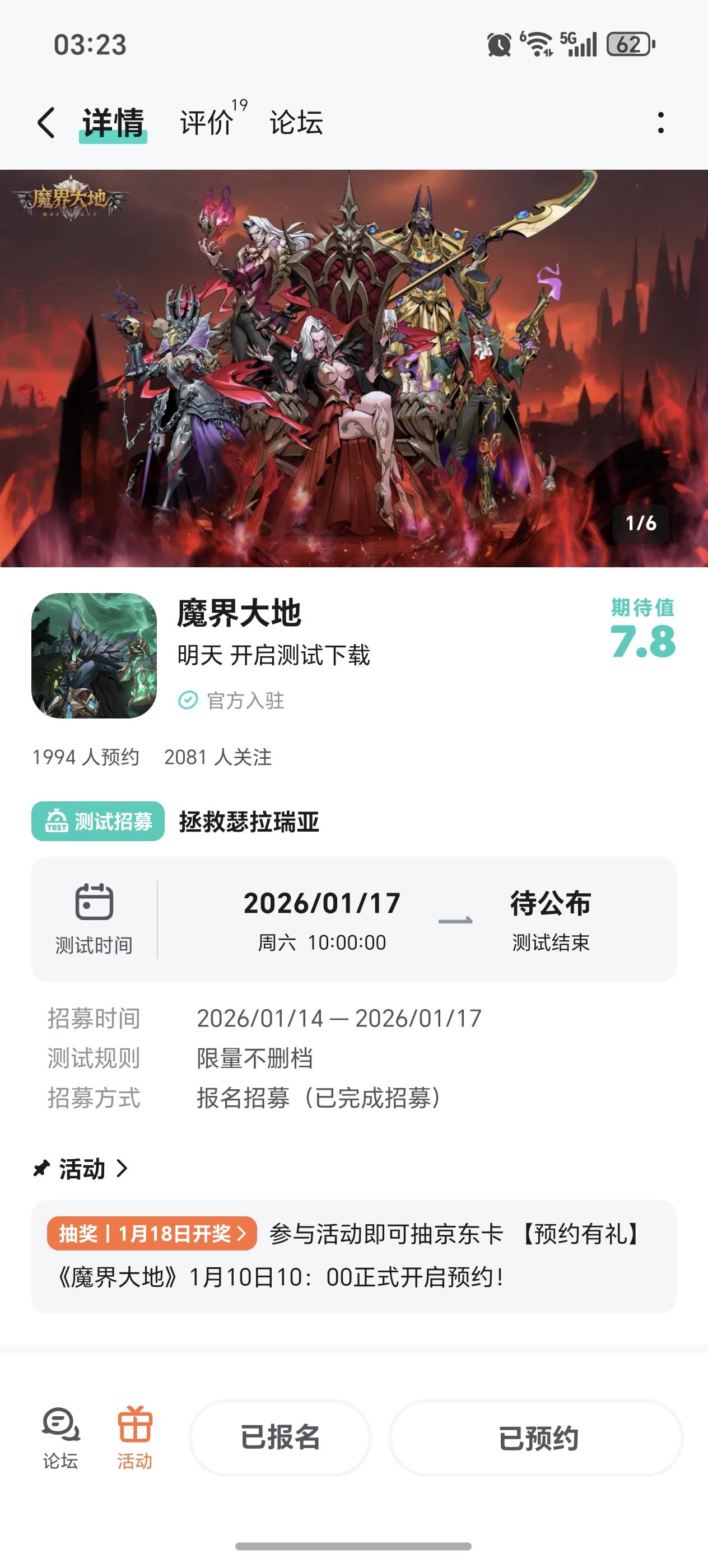 原本平静的瑟拉瑞亚,魔族邪神卷土重来,而你为守护瑟拉瑞亚,来到了《魔界大地》。>>>点击即可预约【参与方式】1.关注《魔界大地》且发新帖晒截图2.在本帖下方评论区分享发帖链接即可【活动时间】即日起~2026年1月18日 23:59【活动奖励】京东卡,共10份【注意事项】1.仅有符合活动要求的评论会被视为有效参与活动,若回复内容未能满足活动要求,则被视为无效回复,取消获奖资格。2