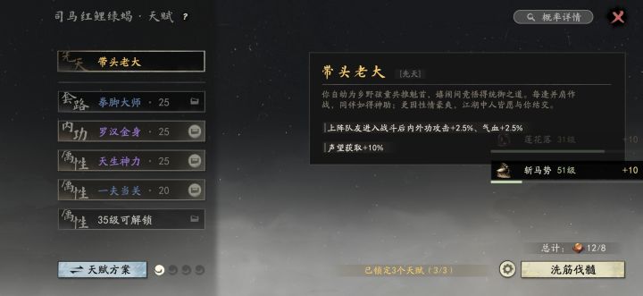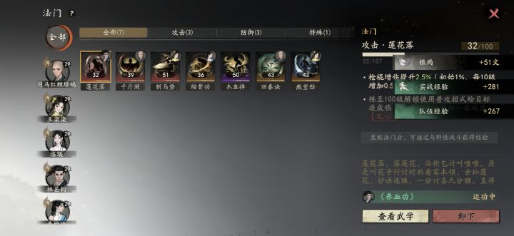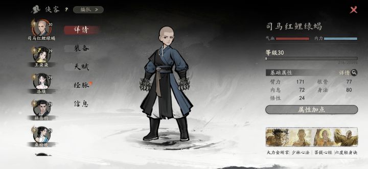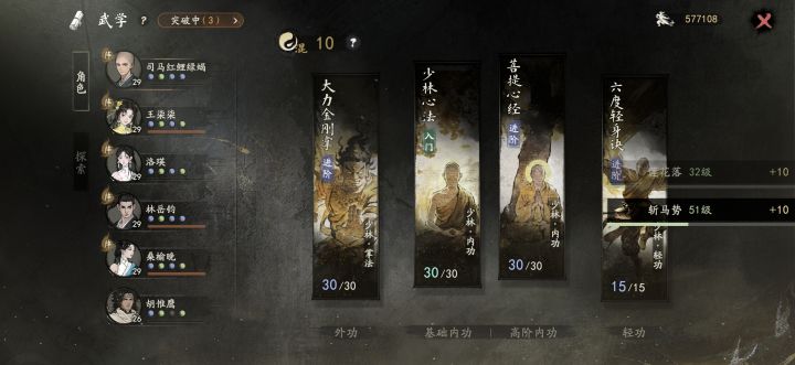 少林体验是真的差,华山那边进阶出师功法学到指定就可以申请了。少林这边第一道难关佛法40级,这玩意设计有毒,拜师给的心经只能读到30级,后面只能靠一天一次禅房念经获取了,剩下就看大世界探索感悟佛法了。功法后面很多选项跟佛法等级挂钩,然后少林给的两个法门一个缩骨,一个木鱼(提升佛法获取经验值的,也是一天一次)。唯一好处就是功法分支多,拳,掌,指,棍四个方向,还有就是藏经阁边上大树可以感悟获取一点悟性。