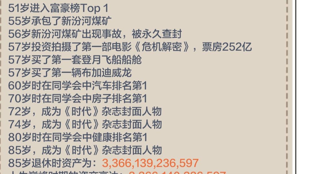 3万亿…卡娅之前能玩到30亿算是合格,出了卡娅就能从30亿到1万亿了。 以下是几个时间节点: 1.30岁开到700仓库(初始200,传家宝每年+9,加上买的) 2.40岁药厂20万股,药厂是可以越长越高的,无脑买就行。 3.50岁积累财富,买卖物品和积累股票,为买球队做准备。 4.60岁买球队准备拉伸股票(直接买最好的18亿那个,银河舰队),我是双球队,宇宙队也买了。另外60岁也是开始拍电影了,投资30亿(声望5000+为了吸引橙色导演和演员),基本每把至少赚30亿。 5.70岁资产达到500亿,药厂100万股,此时卡娅已经不重要了,去刷松岛纯子拍恐怖、科幻、成人类电影增加票房的。 6.80岁没啥了,声望9999,钱也有两万亿了。两支球队升满以后不用担心股票不涨,我股票都涨到1万块了,300万股。 7.85岁这年各项收益直接直接刷出来1380亿+,对了中间有个彩蛋就是我把所有的矿全部封了(想做矿的成就又懒得经营,结果就是…全封)。 8.达成了29个成就,天赋和传家宝图里有。 总结:这个游戏的基本经营攻略论坛其他帖子有,算是基本玩法,做出卡娅之前拍电影很勉强,之后就很方便了。