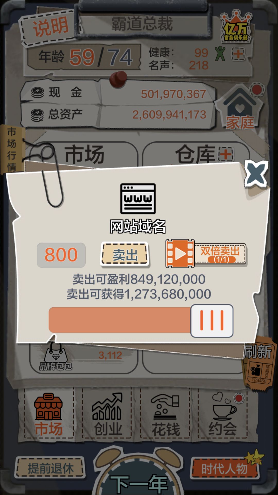总结: 1.以前玩过,重新下载,一路高歌猛进,第四天; 2.这一整局一直在纠结怎么能够拿下时代人物的成就,为什么萌生拿下时代人物成就的想法?是31、42、43回合的机遇; 3.在该局早期,31回合约会中刷到并果断拿下土耳其卡亚,以三倍倒卖每回合最高价产品,42回合以2w域名拿下443存货,43回合域名天价暴涨到51w,获得2亿流动资金,扩大仓库,同年再购入51w天价域名780个,44回合变卖