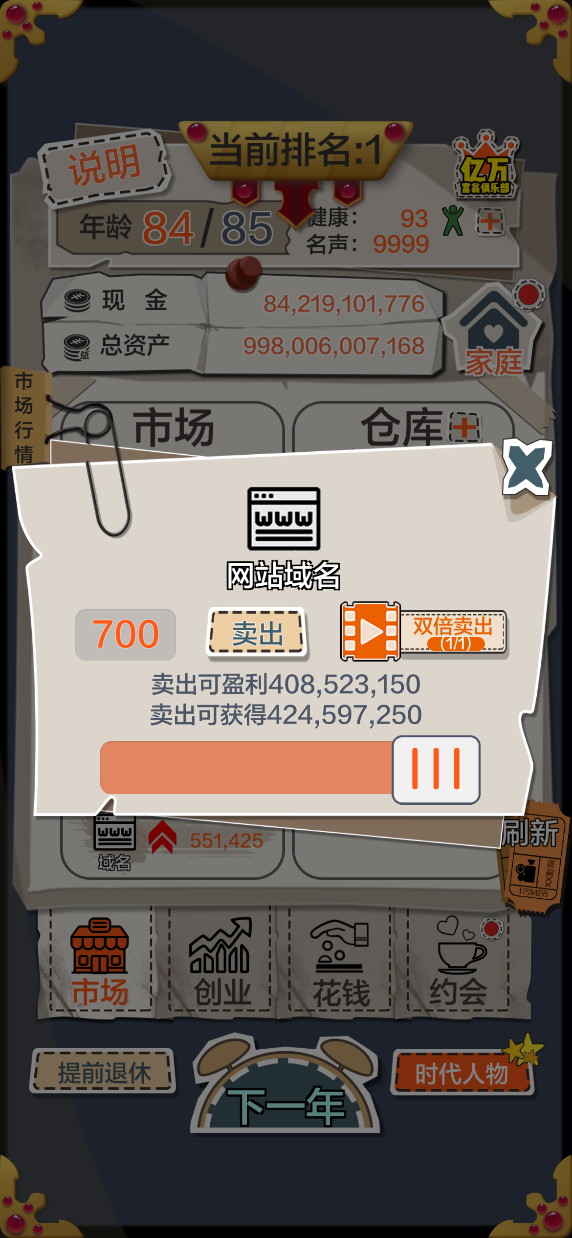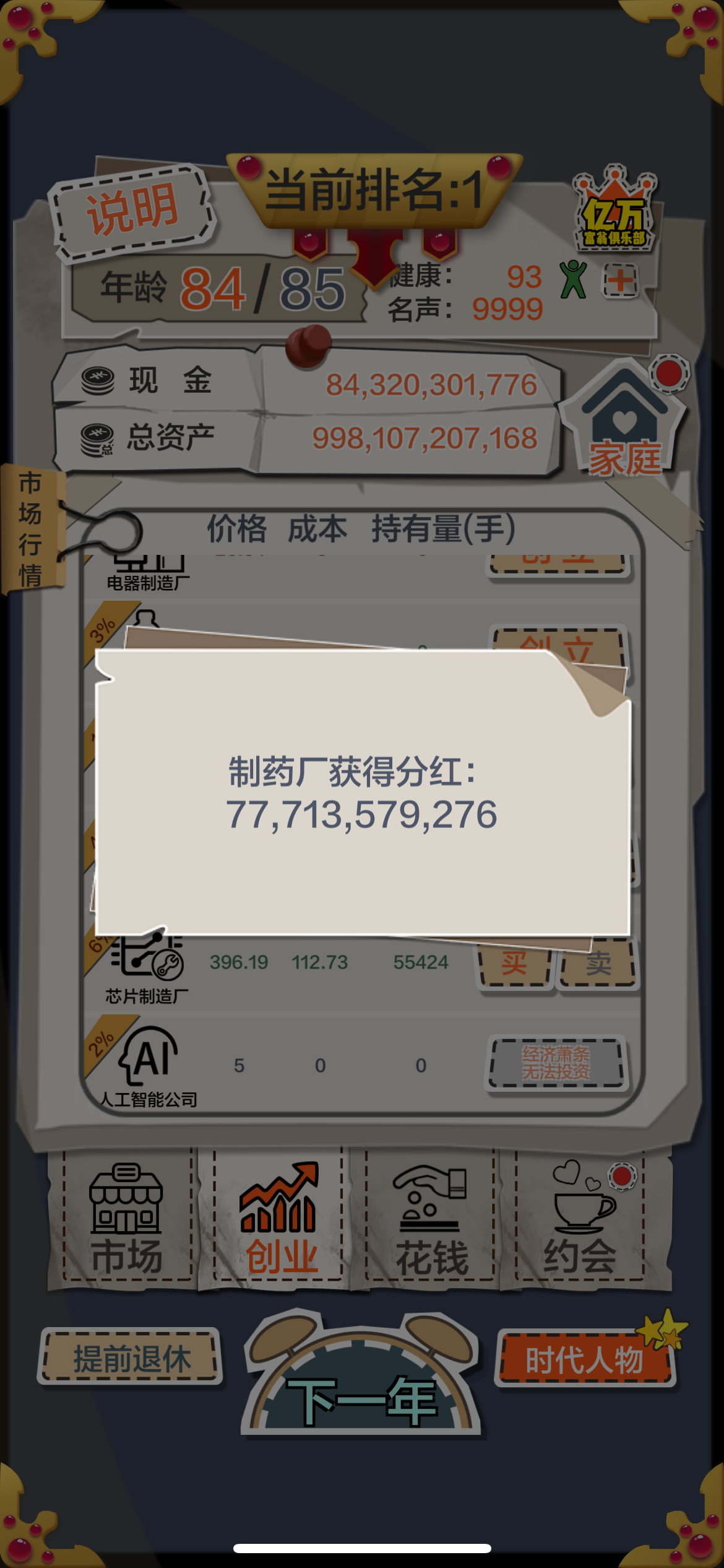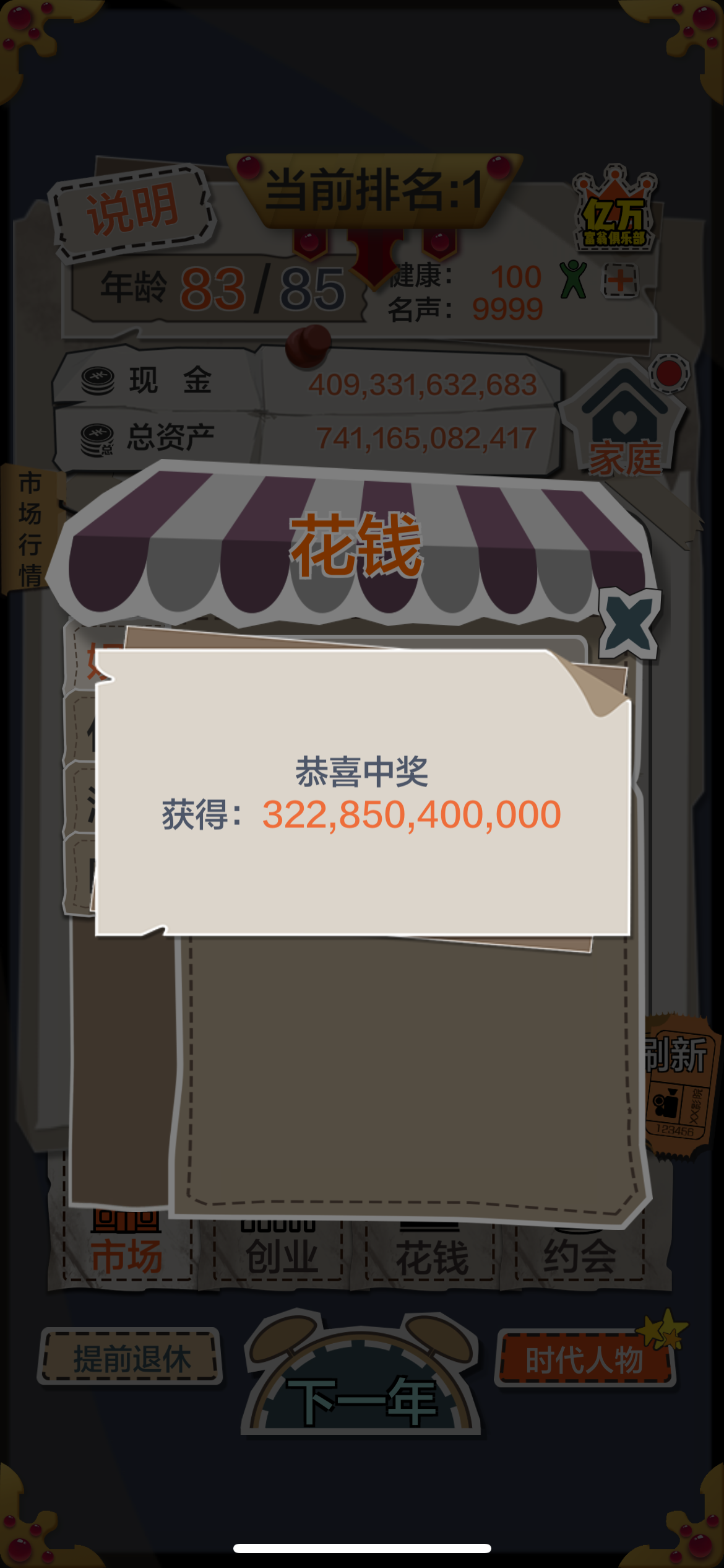 开局没刷到卡亚 心想这把凉了,没想到50几岁的时候公司分红上亿了,不得不说传家宝属性拉满确实日子有盼头 这把到了70多岁公司分红上十亿级别了,接着直接拿下冠军球队为公司做大做强打辅助(我一直隐隐约约觉得球队拿冠可以拉高公司的股票) 上了80岁公司分红几百亿,显然这点钱在万亿级别显得微不足道。 这就不得不提我玩彩票,运气爆棚,中一把三千多亿(没放图) 最后一把直接封神 突破万亿大