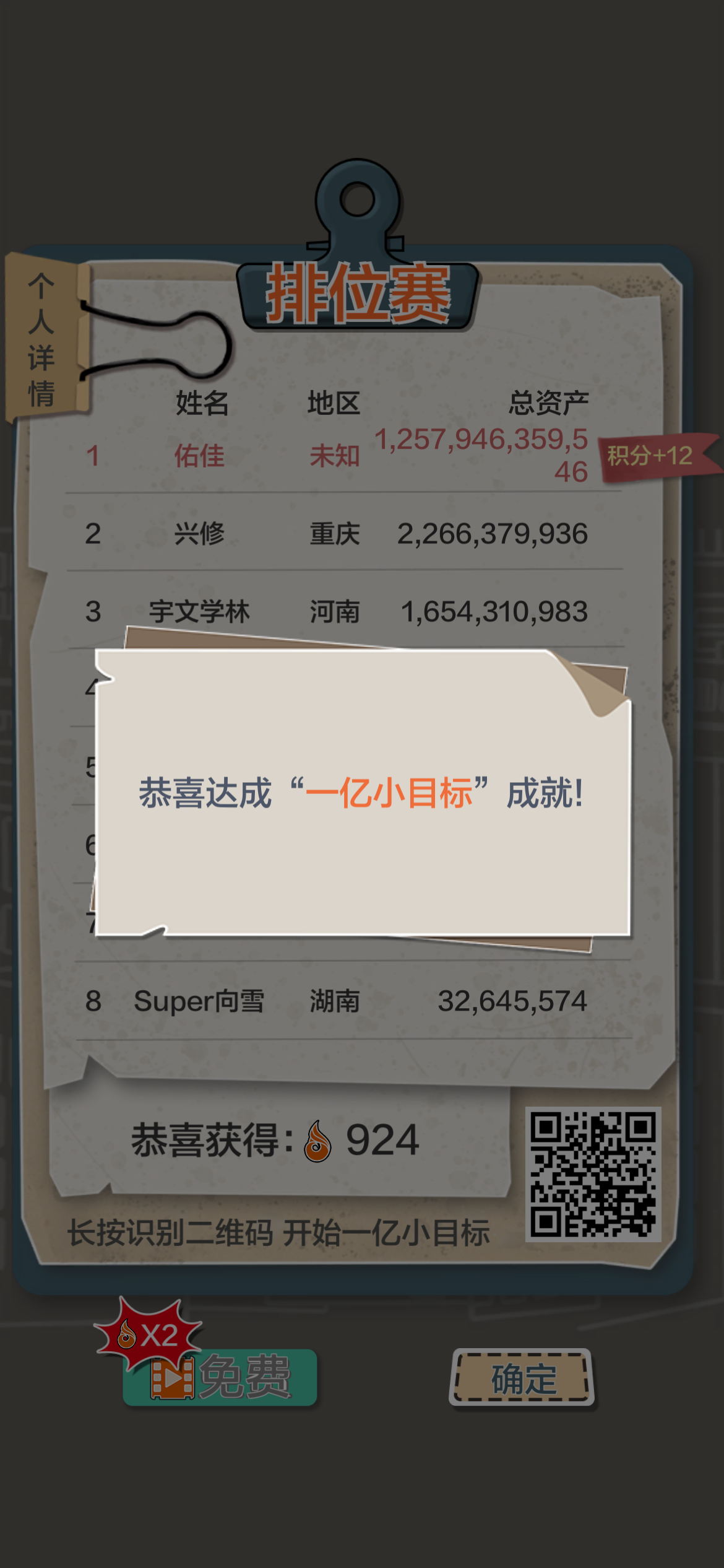 半年没有玩过了,今天无聊玩下,没有退步,5000起步,21岁百万,23千万,退休老师没教我读不出来数值,想要和我那样玩的那么高资产,可以留言我回告诉你们一个简单容易高分的方法