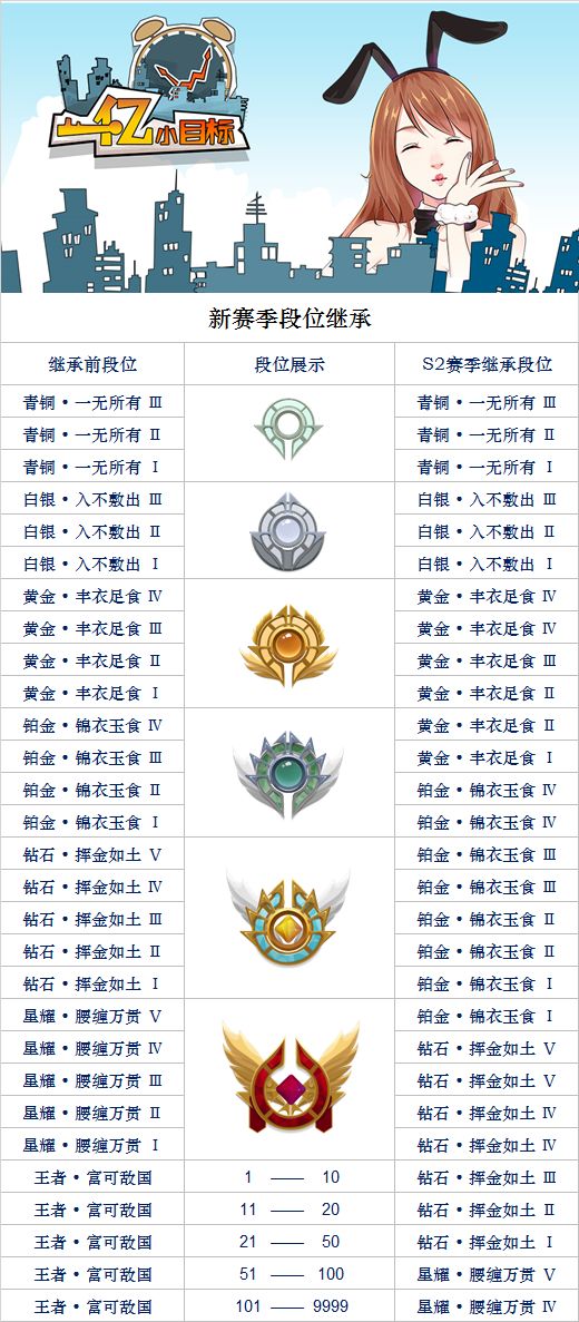 各位老板好,我们计划于2019年8月19号进行版本更新,本次版本更新后,我们将迎来S3赛季的开启,参与过S2赛季的玩家,可领取相应的赛季结算奖励,其中包含专属纪念传家宝哦。一、段位继承规则参与过S2赛季的玩家,可对当前段位进行继承。系统将根据玩家在S2赛季的最终段位,来设定玩家在S3赛季的初始段位。具体段位继承关系如下——若有参与过S1赛季,但未曾参与过S2赛季的玩家,