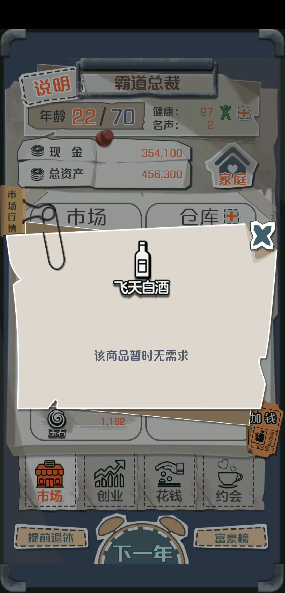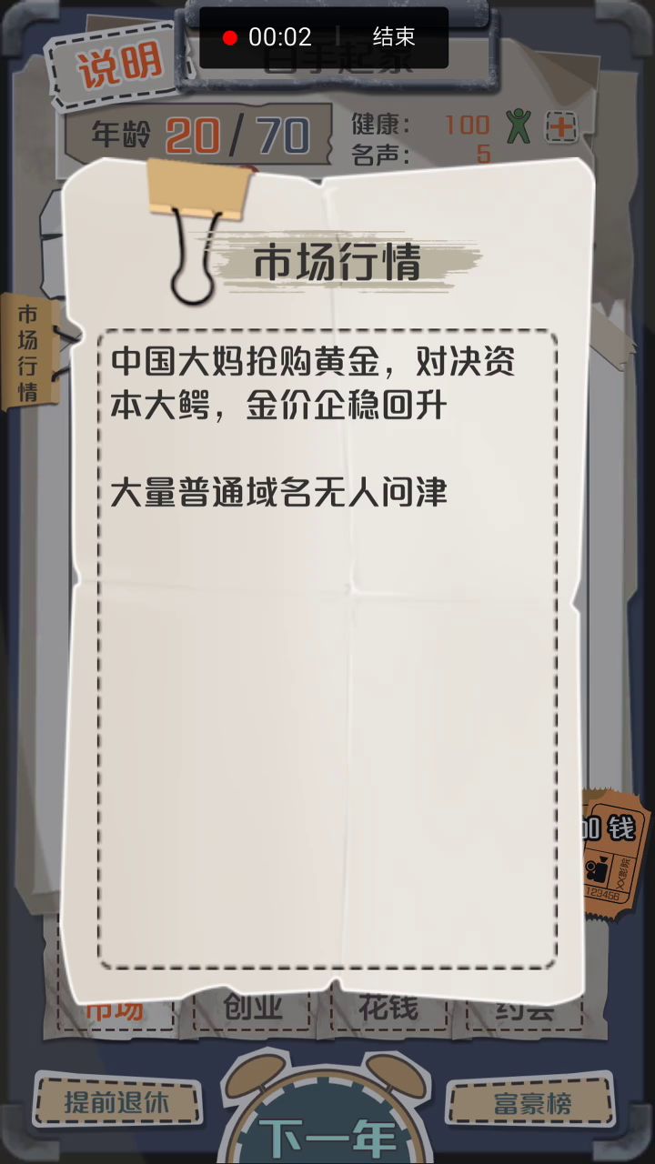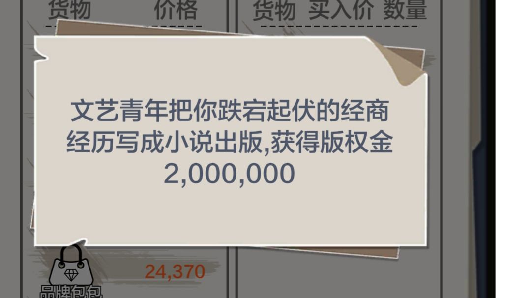 前期发育极其有效 (没解锁包包还有药厂的速度点天赋解锁了啊) 视频中有误操作所以删了一部分 思路: 开局买容易心情激动的物品(通常是包包最容易,低买平卖都会增幅过大) 然后约会圣地(基本一到两次就出文艺了) 约他超便宜的 现金不过万(买了物品没有钱就行) 然后等暴富(低价包到手一到两年必暴富) 当然在怎么富有也就差不多10w这时候有文艺的话,他会写作,然后你可以直接拿200w 这时候开仓库(继续屯包,如果买的低价的包又会暴富,要是买的高价那就亏,不过文艺青年不管你暴富还是穷都会写书,懂?) 然后就能一波拿下药厂,运气好房地产或者芯片厂也能一起拿下 然后你只需要不断的投资药厂 同时低买高卖就行了 速刷一局500+天赋点