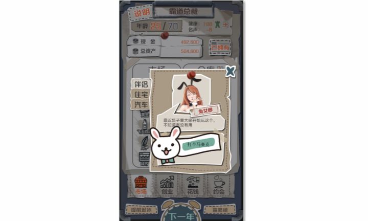 各位老板,好久不见,一直都有老板反馈说,可投资的内容太少了!每局游戏时长太短了!开局初始资产太低了!话不多说,直接上图:新玩法具体是什么呢?家族天赋又该如何获取呢?快来看看吧。V2.3【亿万富翁俱乐部,财运来了挡不住】为了让已经熟悉游戏的老板,能体验到更多的内容,单局内游戏资产达到一亿时,亿万富翁俱乐部的入口就会打开哦。目前版本的俱乐部,内设下列两种新鲜玩法,「经