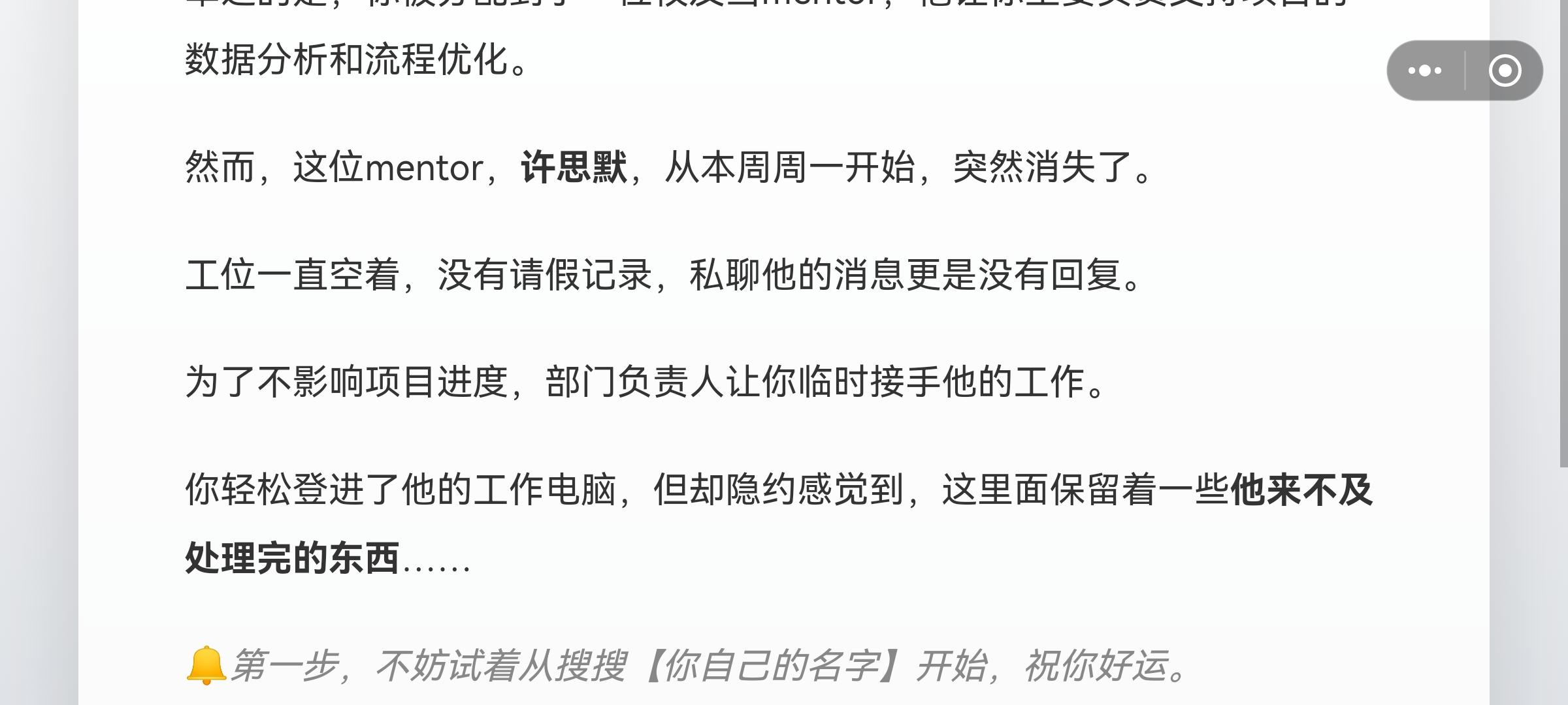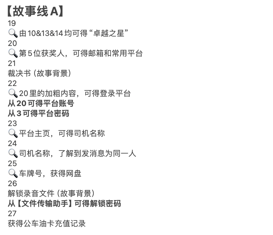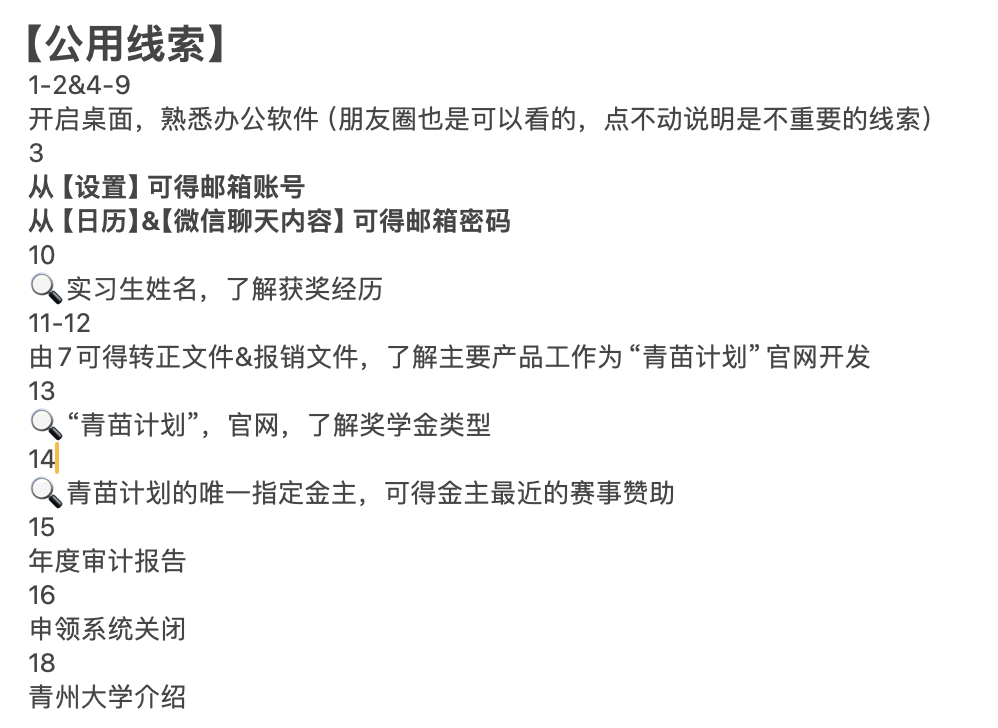 【公用线索】1-2&4-9开启桌面,熟悉办公软件(朋友圈也是可以看的,点不动说明是不重要的线索)3从【设置】可得邮箱账号从【日历】&【微信聊天内容】可得邮箱密码10 🔍实习生姓名,了解获奖经历11-12 由7可得转正文件&报销文件,了解主要产品工作为“青苗计划”官网开发13🔍“青苗计划”,官网,了解奖学金类型14🔍青苗计划的唯一指定金主,可得金主最近的赛事赞助15年度