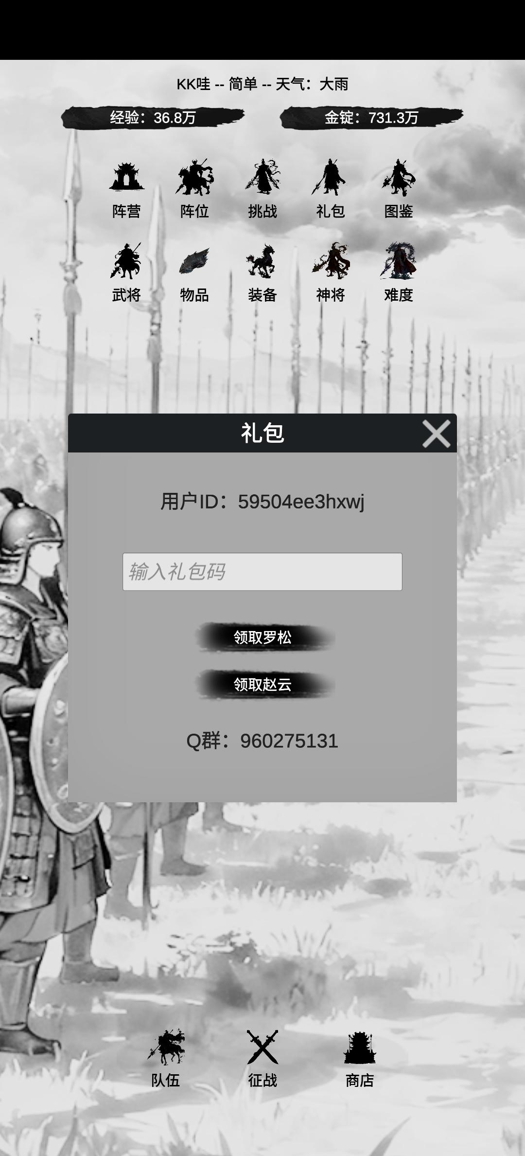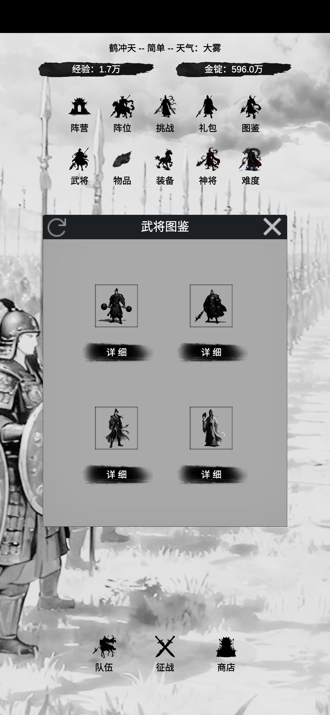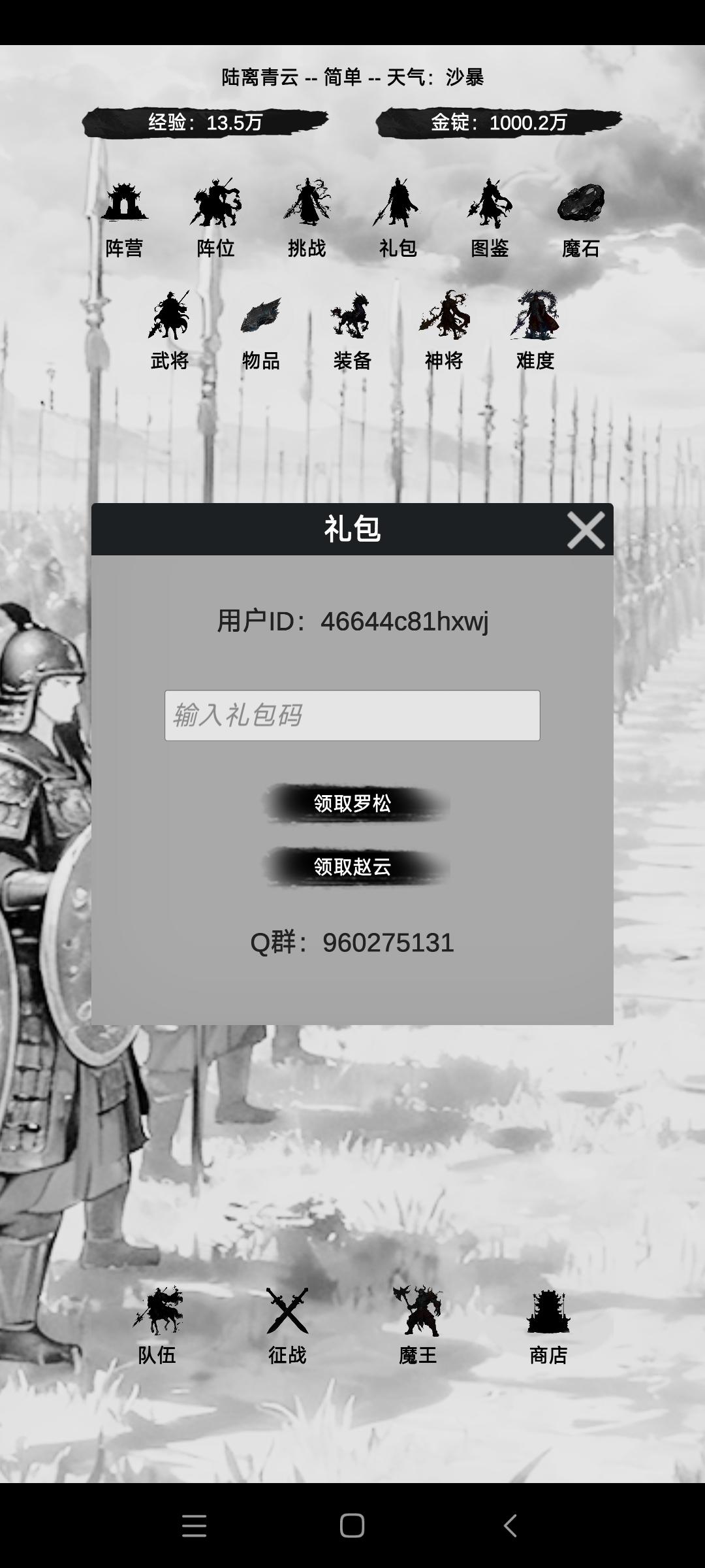 操作简单,挂机,打怪,收集武将,装备,不同的组合,有不同的玩法。 主角 获得的武将,可以设置为主角。 武将 挂机可获得,神将可用碎片合成,属性随机。 武将羁绊 有相同羁绊的上阵,激活后,会有额外属性。 装备 属性随机,神器可以用碎片合成。 装备最高为神器,商店有卖装备。 装备词条随机,可以炼化,升级,重置。 副本 征战目前有三个副本,可以掉落相关石头。 随机奖励 每次进