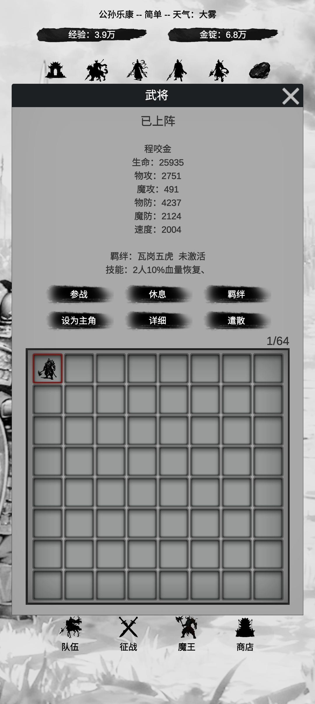 操作简单,挂机,打怪,收集武将,装备,不同的组合,有不同的玩法。 主角 获得的武将,可以设置为主角。 武将 挂机可获得,神将可用碎片合成,属性随机。 武将羁绊 有相同羁绊的上阵,激活后,会有额外属性。 装备 属性随机,神器可以用碎片合成。 装备最高为神器,商店有卖装备。 装备词条随机,可以炼化,升级,重置。 副本 征战目前有三个副本,可以掉落相关石头。 随机奖励 每次进