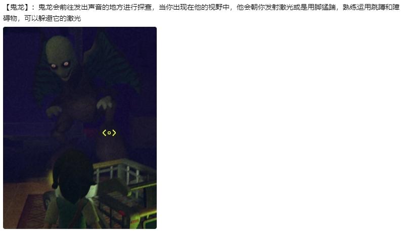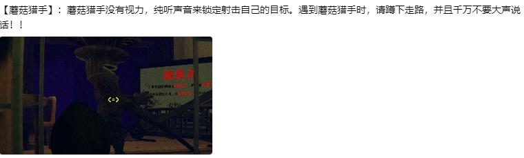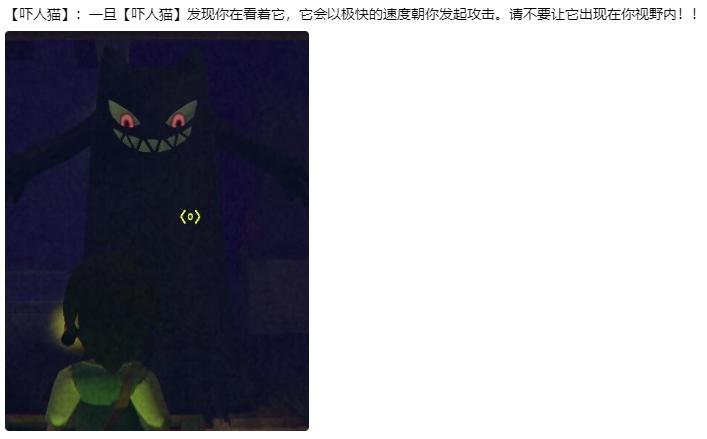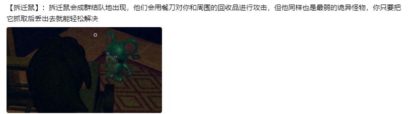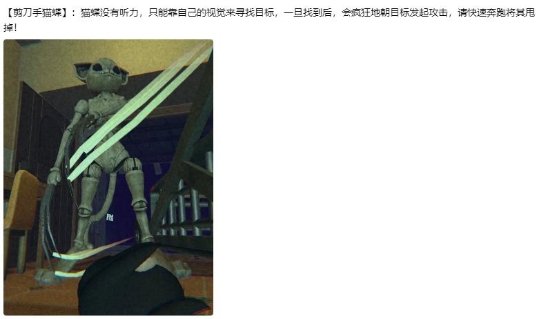怪物介绍黑猫🐱最难缠的莫过于黑猫了,黑猫只有攻击时有尖叫和张嘴动作,每次攻击扣50血。你说要打黑猫?满足你。在你搬东西时,黑猫经常在回收点妨碍你,感觉很安静时,就是黑猫出现时!说不定就在回家路上堵着你。解决方案:被攻击时立马移开视线,这会使黑猫移速大幅下降,将它勾引至桌下用武器攻击,手枪7枪致死,你可移动不了一个影子。听说它有个恐龙一样的尾巴。大恐龙🦕他只会攻击站立的你,多蹲下,你也可