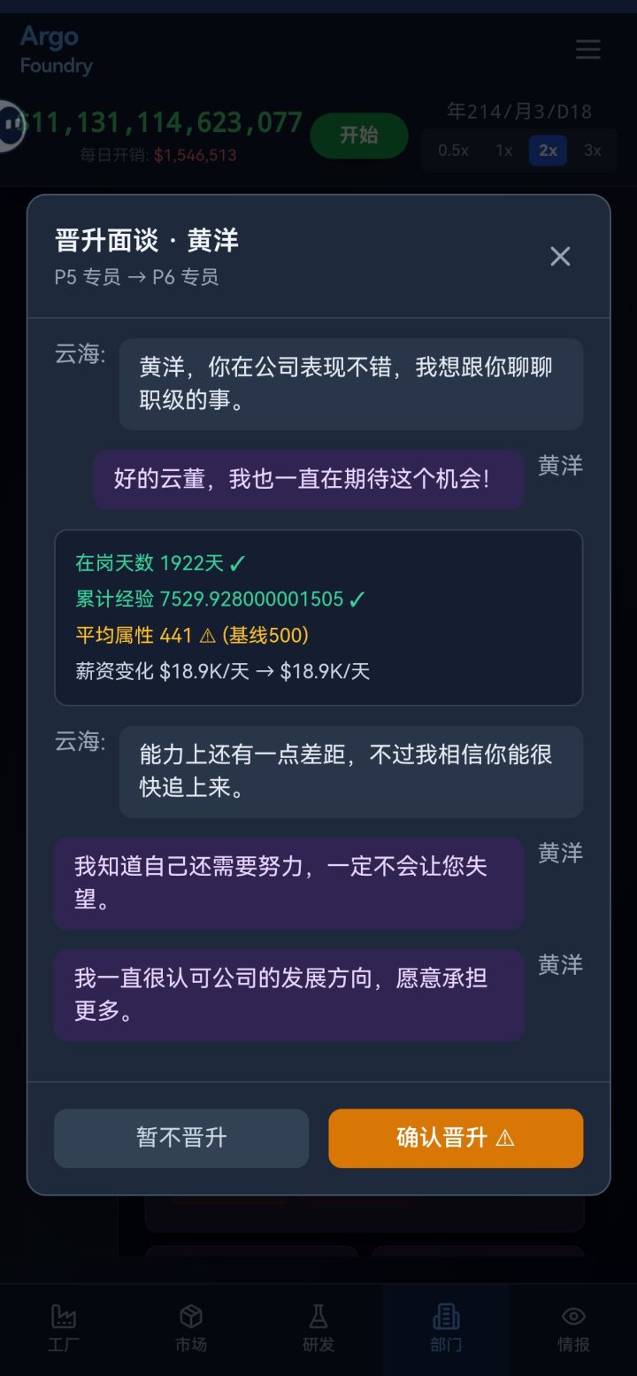 v0.2.0 版本更新,祝大家新春快乐! 新版本审核中,即将发布,更新内容如下: 1. 研发+HR部门初步建设,面试招聘超强员工 2. 游戏内外大量性能优化 3. 排行榜测试 4. Fab数量提升 5. 员工成长/晋升,增强部门实力 6. 部门管理系统初步搭建,应对丰富的部门事件 7. 游戏百科 8. 顶部布局自由选择,更美观的同时避免遮挡 9. 研发部门自动工艺调优 10.