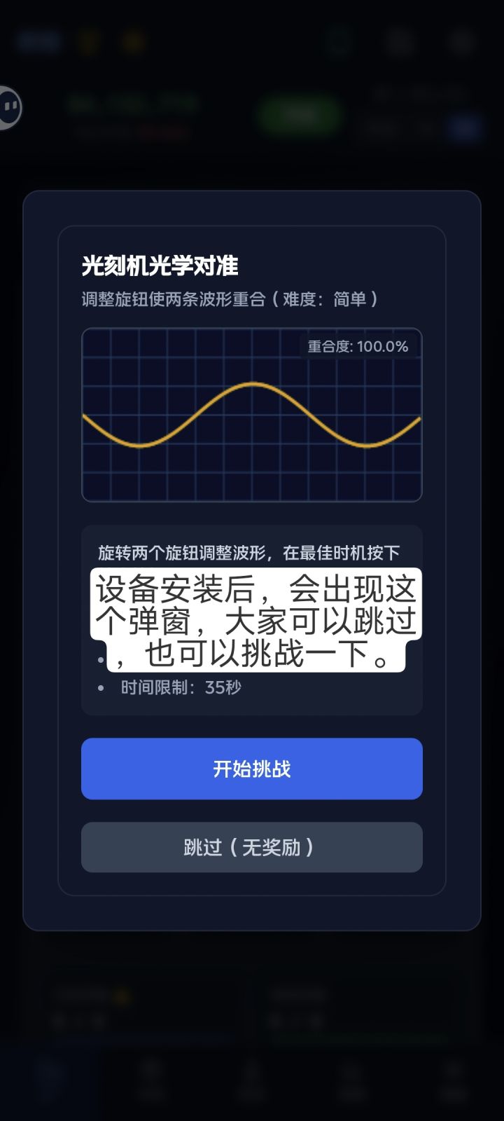 v0.1.4 版本正在审核中,即将发布,具体更新内容如下:1. 市场部初步建设,解放双手2. 追加新型设备,产能暴涨3. 优化提升良率和运行工程晶圆的体验4. 重做订单谈判+影响力,增加生产前提示5. 增强设备兼容性(部分之前无法游玩的设备,主要出现于 Android8/9/10等)6. 修复不兼容设备的显示效果问题(显示灰白色块等)7. 修复设备卖出/维护的问题8. 修复产能、自