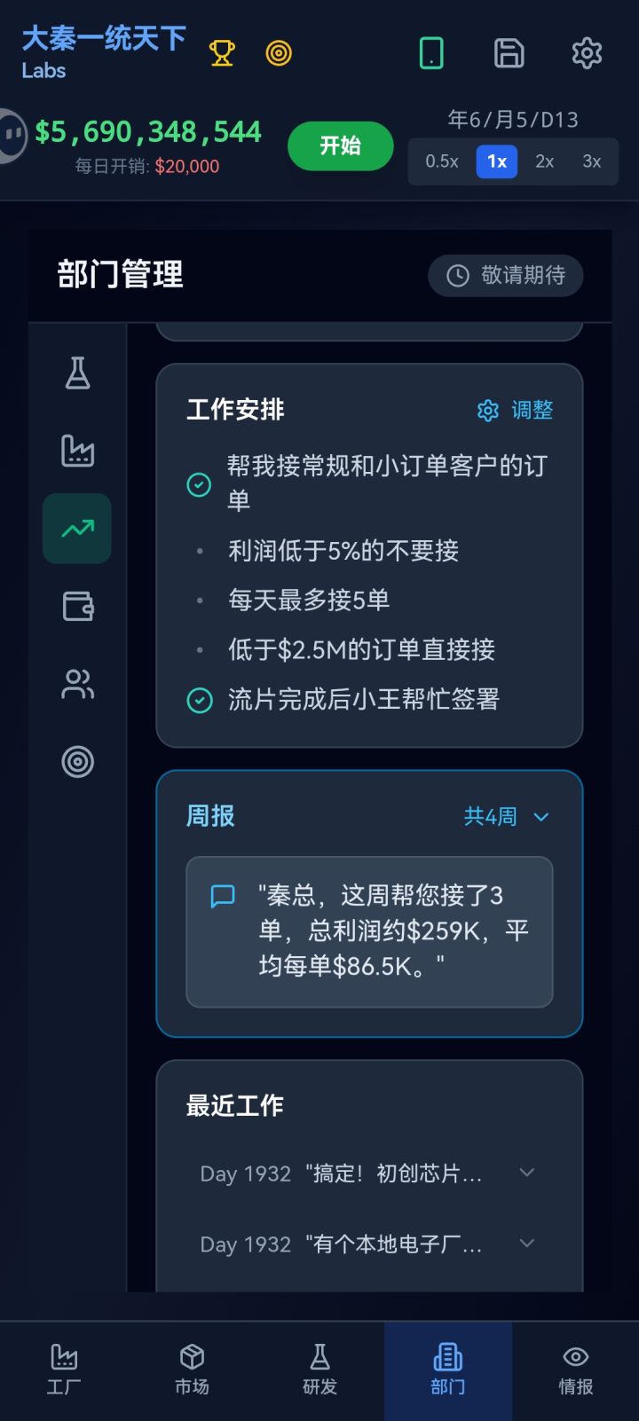 v0.1.4 版本正在审核中,即将发布,具体更新内容如下:1. 市场部初步建设,解放双手2. 追加新型设备,产能暴涨3. 优化提升良率和运行工程晶圆的体验4. 重做订单谈判+影响力,增加生产前提示5. 增强设备兼容性(部分之前无法游玩的设备,主要出现于 Android8/9/10等)6. 修复不兼容设备的显示效果问题(显示灰白色块等)7. 修复设备卖出/维护的问题8. 修复产能、自