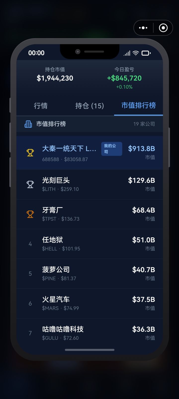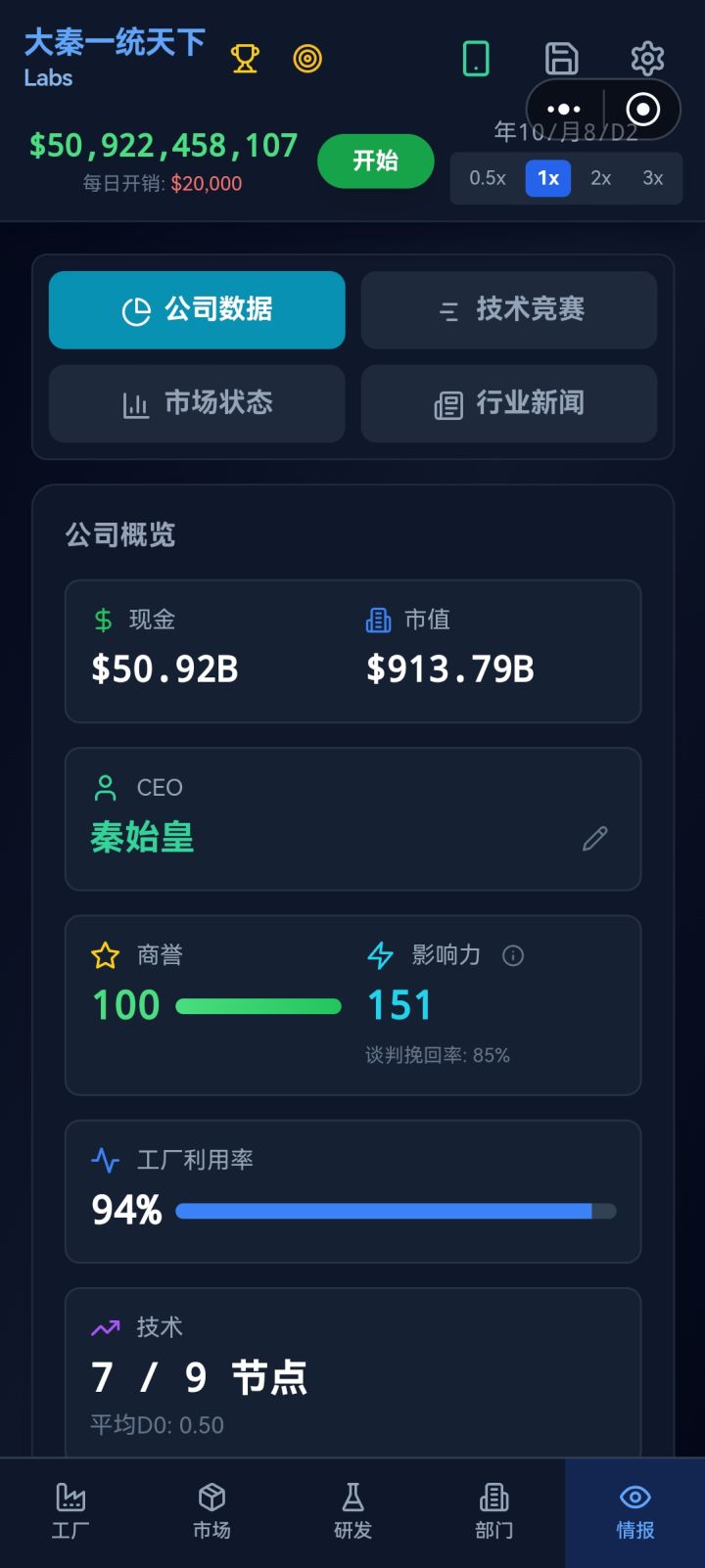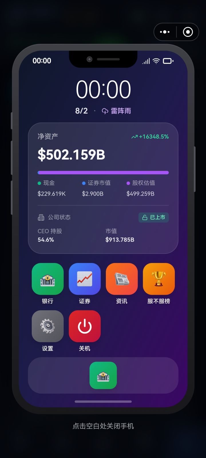 一,我这里本来有50B的现金,打算抄底一家竞争对手的全部股票(图一)。买完以后手机上显示现金已经花完了(图二),买了很多的股票,但是主页面现金还是50B多(图三)并正常增长(我有很多订单在交付,赚的挺快的),这个问题不知道别的玩家有没有遇到,我的机型是华为nova12活力版二,我自己的公司刚上市(实际上是这几天共玩了十个小时才发现右上角那个手机界面标),一开始股票一文不值(0.01一