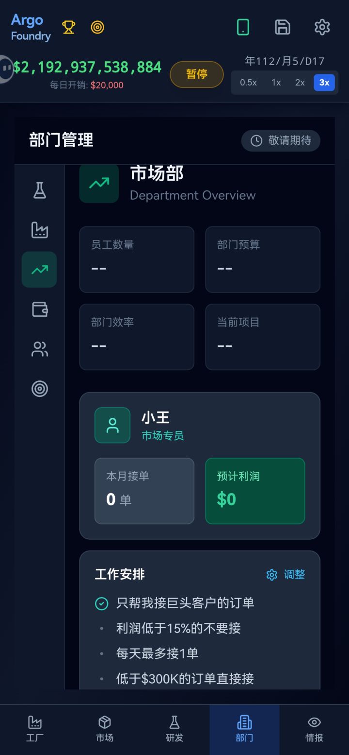 #芯片大亨 工作部署可以选择有更多选择最好 ,现在局限性比较大 ,然后就是本月接单,有一个日结单最好,本月接单,全权交给他,又不能谈判,接的多 干不完 ,一样的没用,今天玩了一下新的光刻机 速度还是不错,除了接单哪里给我感觉有点鸡肋,其他的 还是需要人手频繁操作