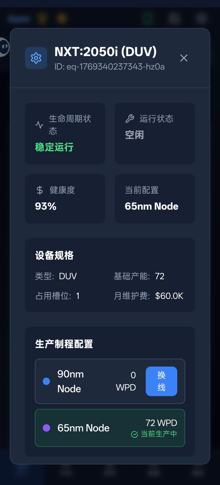#芯片大亨 工作部署可以选择有更多选择最好 ,现在局限性比较大 ,然后就是本月接单,有一个日结单最好,本月接单,全权交给他,又不能谈判,接的多 干不完 ,一样的没用,今天玩了一下新的光刻机 速度还是不错,除了接单哪里给我感觉有点鸡肋,其他的 还是需要人手频繁操作