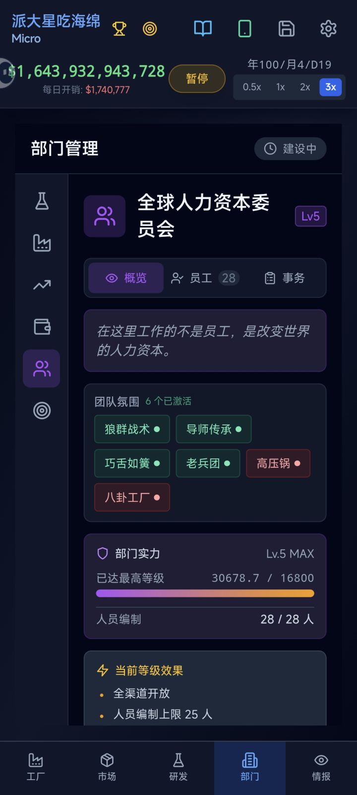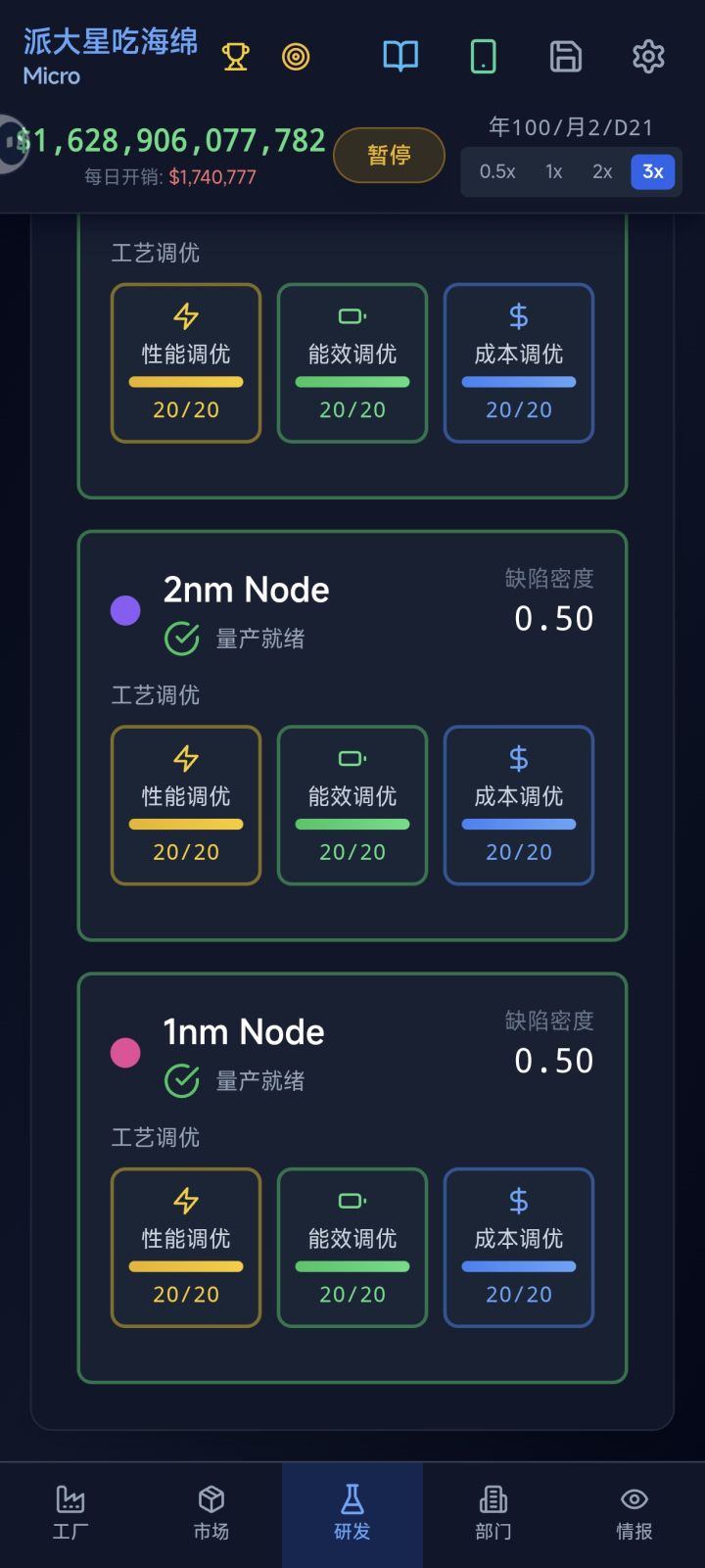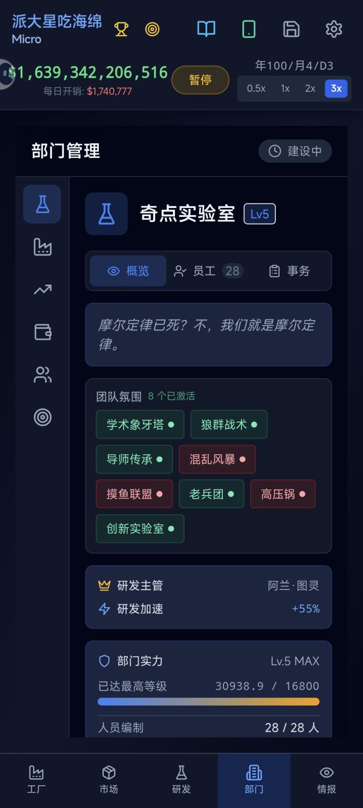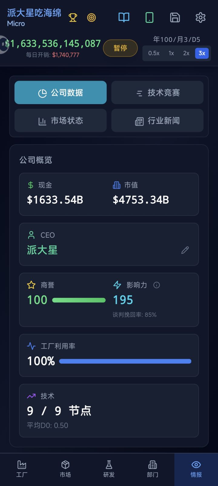 玩了5 6个小时,后面建设新的工厂,要1000B,虽然可以挣到,也不算很难,但这个增长速率可以慢点,然后就是到了后期因为大部分资产都在公司股票里,然后后面1nm垄断结束后,公司股票大幅下降,直接损失几个T