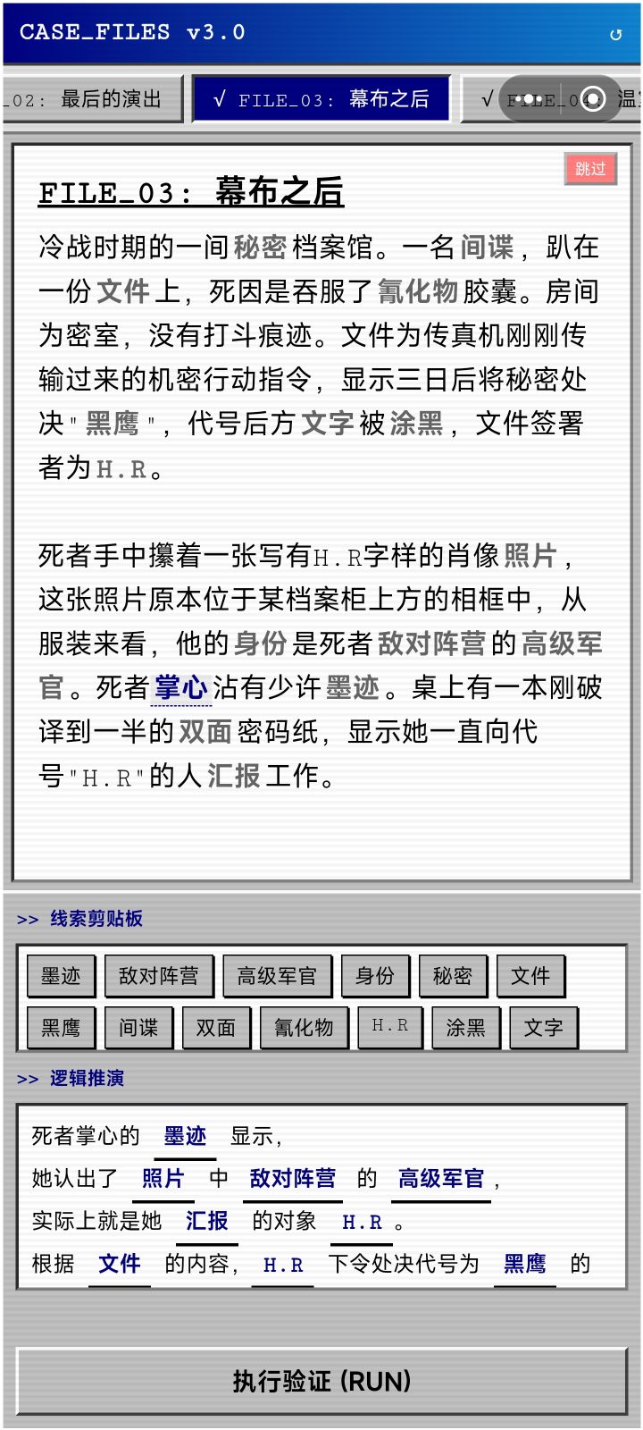 黑鹰正坐在档案馆里,破译刚刚截获的一封敌对势力的电报,并且像往常一样,准备把破译的结果汇报给HR。但破译到一半,他发现电报的内容是敌方势力要秘密处决黑鹰(也就是自己),而该文件的签署者也是HR。于是黑鹰意识到HR是一个双面间谍,同时他又了解了自己的处境,已无路可逃。 所以他决定用自己的死传递最后一次消息为自己报仇。他先用墨水把代号后面的自己的名字给模糊掉,档案室里截获的机密行动指令和他破译的其他的向HR汇报的文件,加上他手里攥着的HR的照片。加在一起就会让调查人员明白HR是一个双面间谍