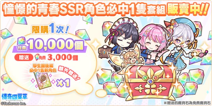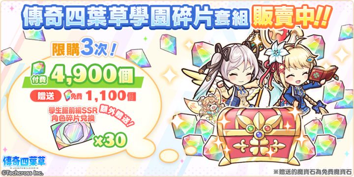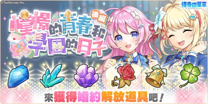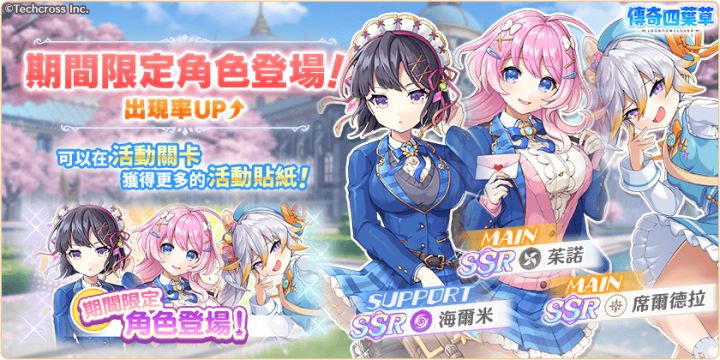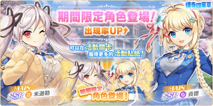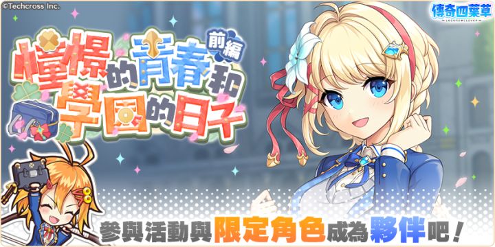亲爱的玩家,您好!感谢您游玩『传奇四叶草』!今日的维护已经结束,现可登入游戏!◆内容更新・「憧憬的青春和学园的日子・后编」活动举办中!・「憧憬的青春和学园的日子・后编」活动举办中!」登入奖励活动!(明日8:00开始)・新角色「海尔米」「茱诺」「席尔德拉」登场!・严选!天命角色转蛋(才知)举办中!・憧憬的青春SSR角色必中1隻套组贩卖中!・憧憬的青春碎片套组贩卖中!・憧憬的青春套