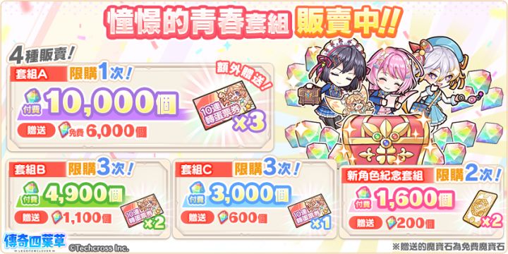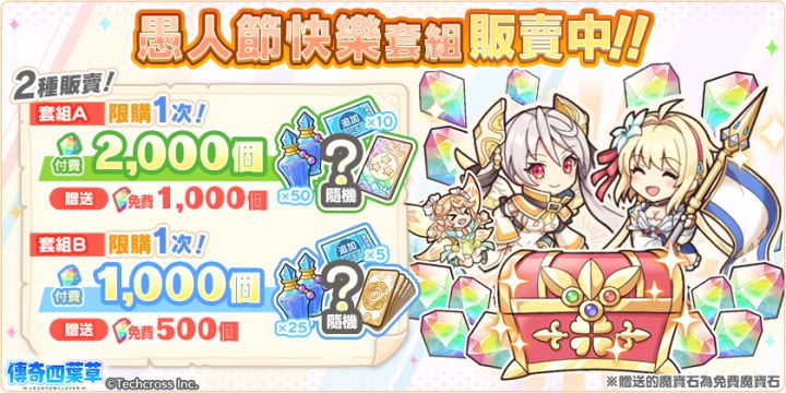 亲爱的玩家,您好!感谢您游玩『传奇四叶草』!今日已开启了以下内容!愚人节快乐套组贩卖中!今后也请继续支持『传奇四叶草』。『传奇四叶草』营运团队