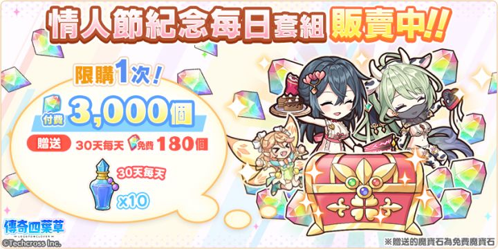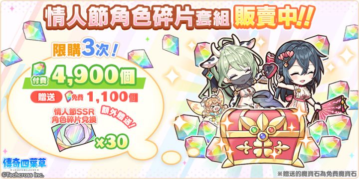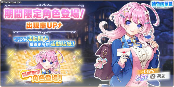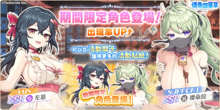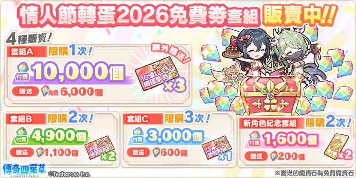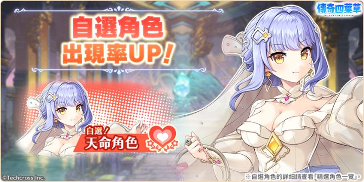 亲爱的玩家,您好!感谢您游玩『传奇四叶草』!今日的维护已经结束,现可登入游戏!◆内容更新・「在给你竭尽全力的诱惑」活动举办中!・「在给你竭尽全力的诱惑」活动举办中!」登入奖励活动!(明日8:00开始)・新角色「左慈」「潘朵拉」登场!・婚约角色精选转蛋登场!・情人节转蛋2026免费劵套组贩卖中!・情人节纪念每日套组贩卖中!・情人节角色碎片套组贩卖中!・左慈&亚蒙婚约套组贩卖中!