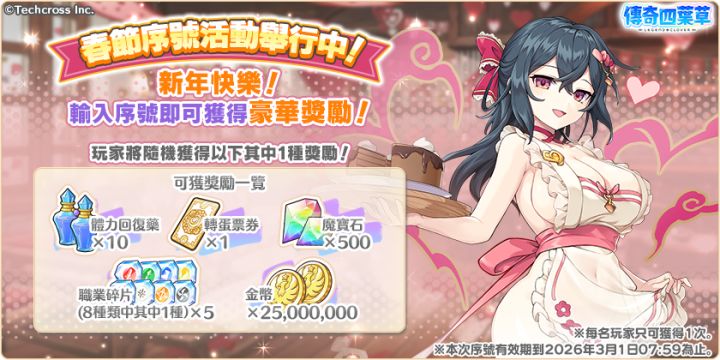 亲爱的玩家,您好!庆祝春节序号发放中喔!请勿错过🍬 ✨ ◆序号输入期间 2026年2月12日 维护后 ~ 2026年3月1日 7:59◆序号:NewYear26SvK今后也请继续支持『传奇四叶草』。『传奇四叶草』营运团队